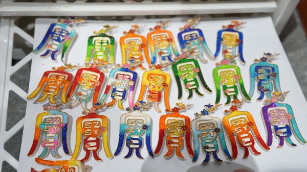 小讲解员将景之蓝文创结合实验学子创意特制的校庆珐琅徽章赠送给现场嘉宾,并介绍道:“校庆徽章整体结构采用繁体篆书‘实’字,结合传统冰梅纹样,庄重典雅,富含文人气息 。中心镌刻SZSY窗棂造型,四朵梅花象征深圳实验学校建校四十周年。枝头飞来的燕子,寓意‘实验之路春常在’。”陈蓉老师补充道:“珐琅工艺需经几十上百道工序,正如实验四十年磨砺的教育匠心。”此时,烤箱中渐变的实验蓝、浓郁的翡翠绿……已如凤凰涅槃般浮现。孩子们举着刚出炉的徽章跑来,未冷却的釉彩在他们掌心流转,五光十色,恍如捧着一汪凝固的星河。