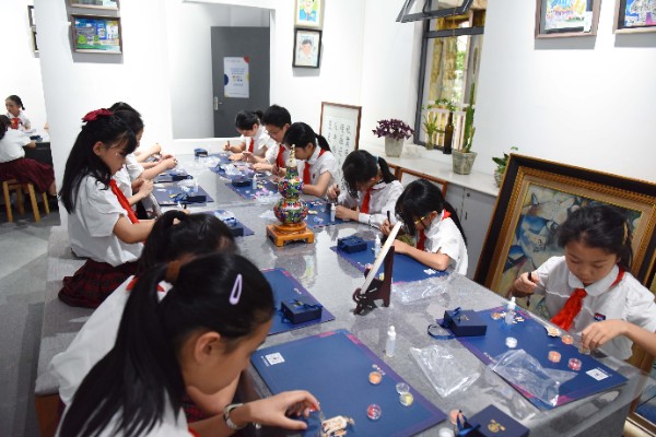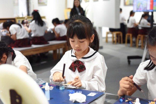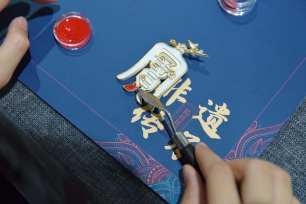 日影西斜时,美术馆化身为非遗工坊。“纹韵实验·锦绣华章”校庆珐琅徽章创作体验开启了当天活动的新篇章。深圳景之蓝文创的常老师为现场四十名学生代表讲解珐琅工艺“掐丝点蓝”的绝技。一年级的桐菲紧握刮刀,在王冰老师的指导下,往金丝勾勒中小心翼翼地填入闪烁着宝石般光泽的釉料。
