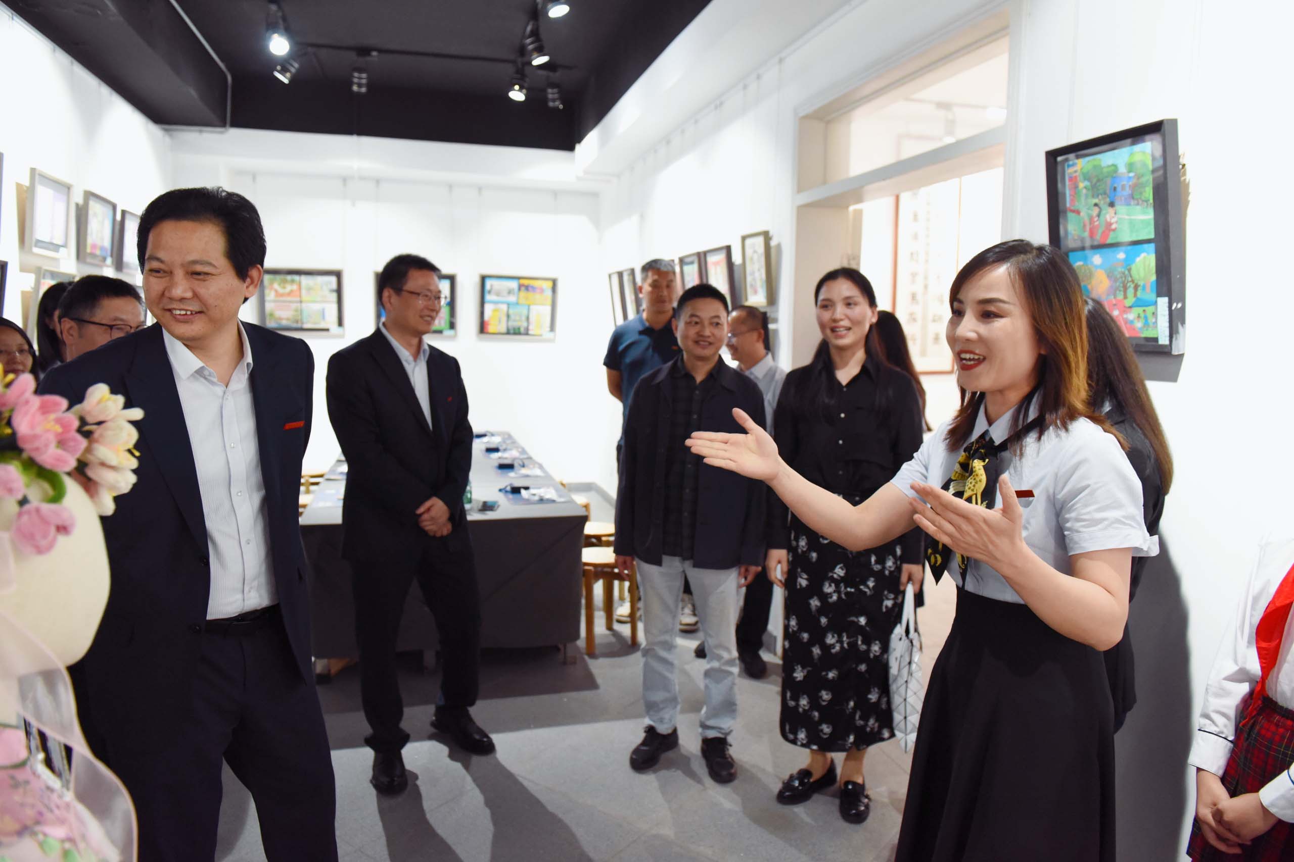 开幕式结束后,领导嘉宾在小讲解员引导下步入展厅。钟国荣老师驻足在一组《纹韵实验·锦绣华章》校庆徽章前,指着一枚融合青铜云雷纹与实验校徽的设计赞叹:“这不仅是纹样的古今对话,更是在孩子们心中播下了文化自信的种子。” 夏育华书记凝望着一墙《童画实验园·光影拾穗》校园写生画作,笑道:“这些画连起来,便是一部实验的《清明上河图》。” 在本年度美育节校庆主题创作中,六个年级的孩子们在美术课上,通过老师们的悉心指导,将经典艺术与校庆元素有机融合在六大主题作品中,用充满创意的画笔表达对母校的感恩与祝福,数百幅精彩画作令在场来宾纷纷赞叹不已。