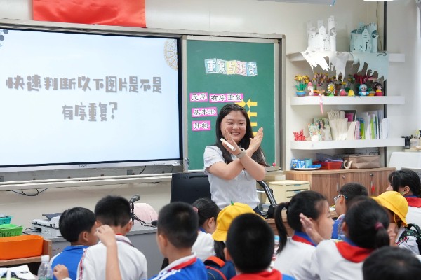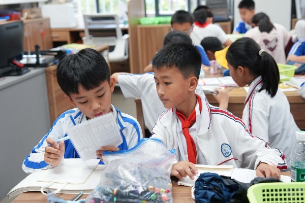 当“美丽中国”支教项目引领饶平县孩子带着大南山的气息,走进深圳实验学校小学部的美术教室,两地学子共执画笔的瞬间便有了特殊的意义。刘丹青老师指导孩子们运用“重复与渐变”的方法,在纸袋上用图案编织美学密码。课程尾声,深饶两地的孩子一起展示自己的课堂佳作,共同创造的美好时光定格在他们绽放的笑颜里。
