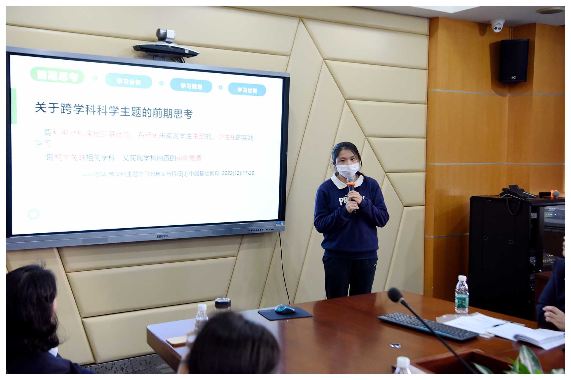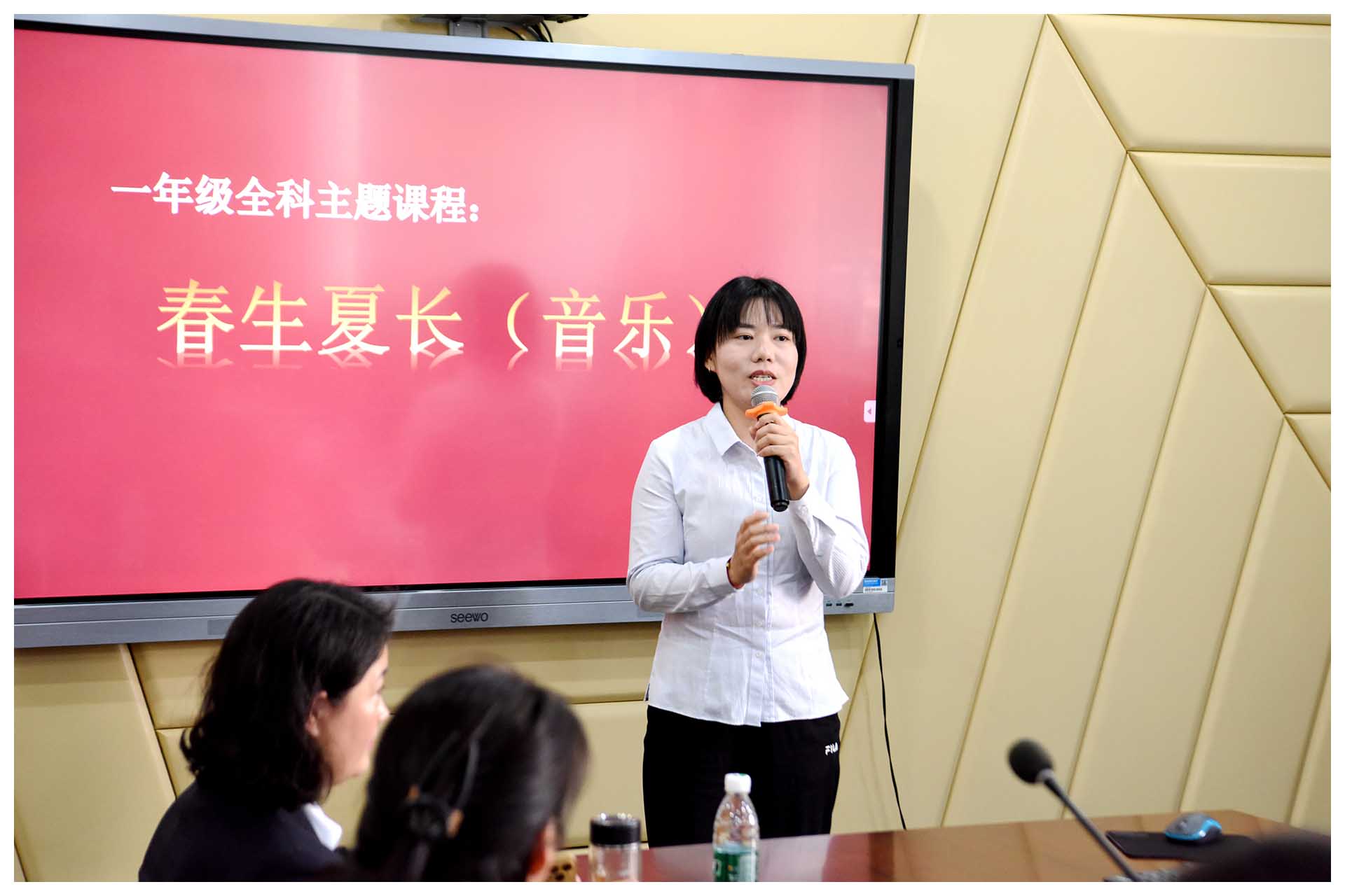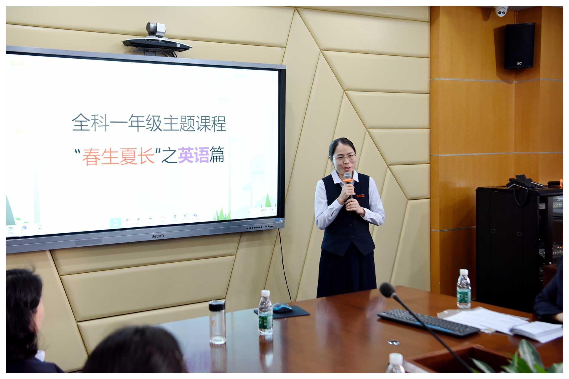 接下来全科一年级组的老师们以本学期的“春生夏长”主题课程为例,向在场的来宾们分享了全科的实践智慧。语文李湘老师、数学张克勤老师、英语曾业洁老师、音乐金田老师、美术黎兵老师分别发言,分享各学科是如何联动、构思与实施的。在充分考虑学生的年龄特点,深入解读国家课程标准下,全科课程人多学科融合,进行多样化活动设计,为促进学生核心素养的形成不懈耕耘。