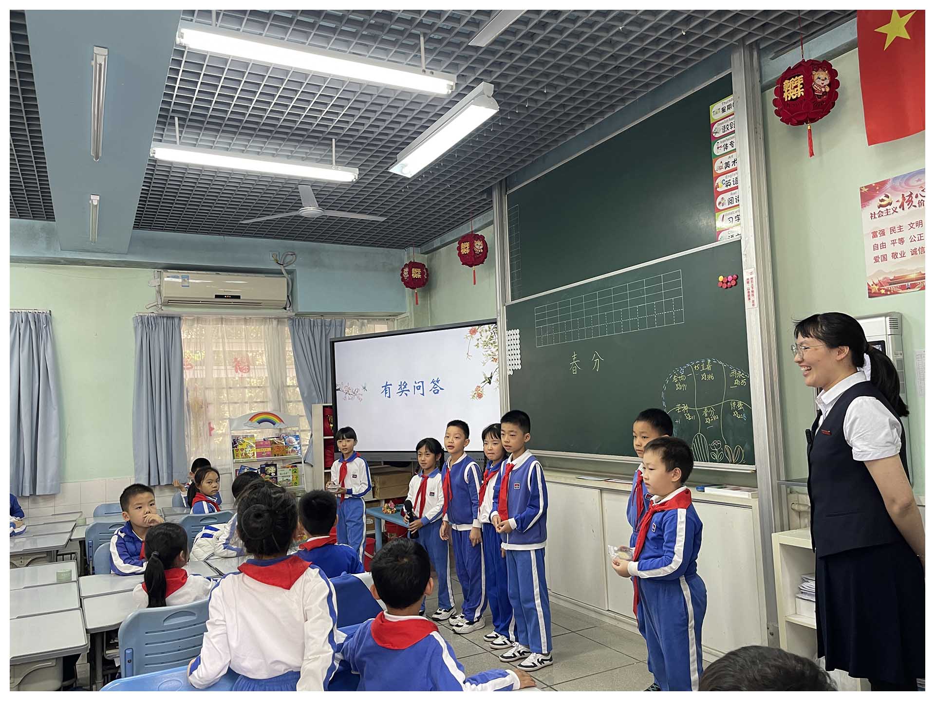 铃声响起,老师们满怀期待地走进全科18班的教室,聆听全科组沈彩云老师带来的二年级“春生夏长”全科主题课程——《春分》。在这堂充满生机的课堂上,同学们展现出对知识的渴求和对传统文化的热爱。首先,班级春分学习小组的同学们自信地登台,从春分的含义、三候、习俗到美食等方面,对春分节气进行了全面而生动的介绍。他们准备充分,表达流畅,让在场的每一位老师都感受到了他们对春分节气的用心了解。其中,花朝节作为春分节气的一个重要习俗,引起了同学们浓厚的兴趣。在沈老师的引导下,大家进一步探究了花朝节的传统习俗,包括斗草之乐和簪花之美。课堂上,同学们亲身体验了斗草的乐趣,他们两两结对,小组PK,或比拼花草名称,或比较花草韧性,玩得不亦乐乎。大家还将美丽的花朵插在发间,体验了簪花的趣味和美好。这堂《春分》跨学科主题课程不仅让同学们深入了解了春分节气的相关知识,更通过自主探究和亲身体验的方式,让他们感受到了中华传统文化的魅力。沈老师以学生为主体,转变了传统的学习方式,让同学们在轻松愉快的氛围中学习,收获了知识与快乐。课后,参观的老师们纷纷表示,这堂课程让他们看到了全科教育的独特魅力。他们赞扬了沈老师的教学方法和同学们的出色表现,并表示将借鉴这些经验,推动自己学部的教育教学改革。