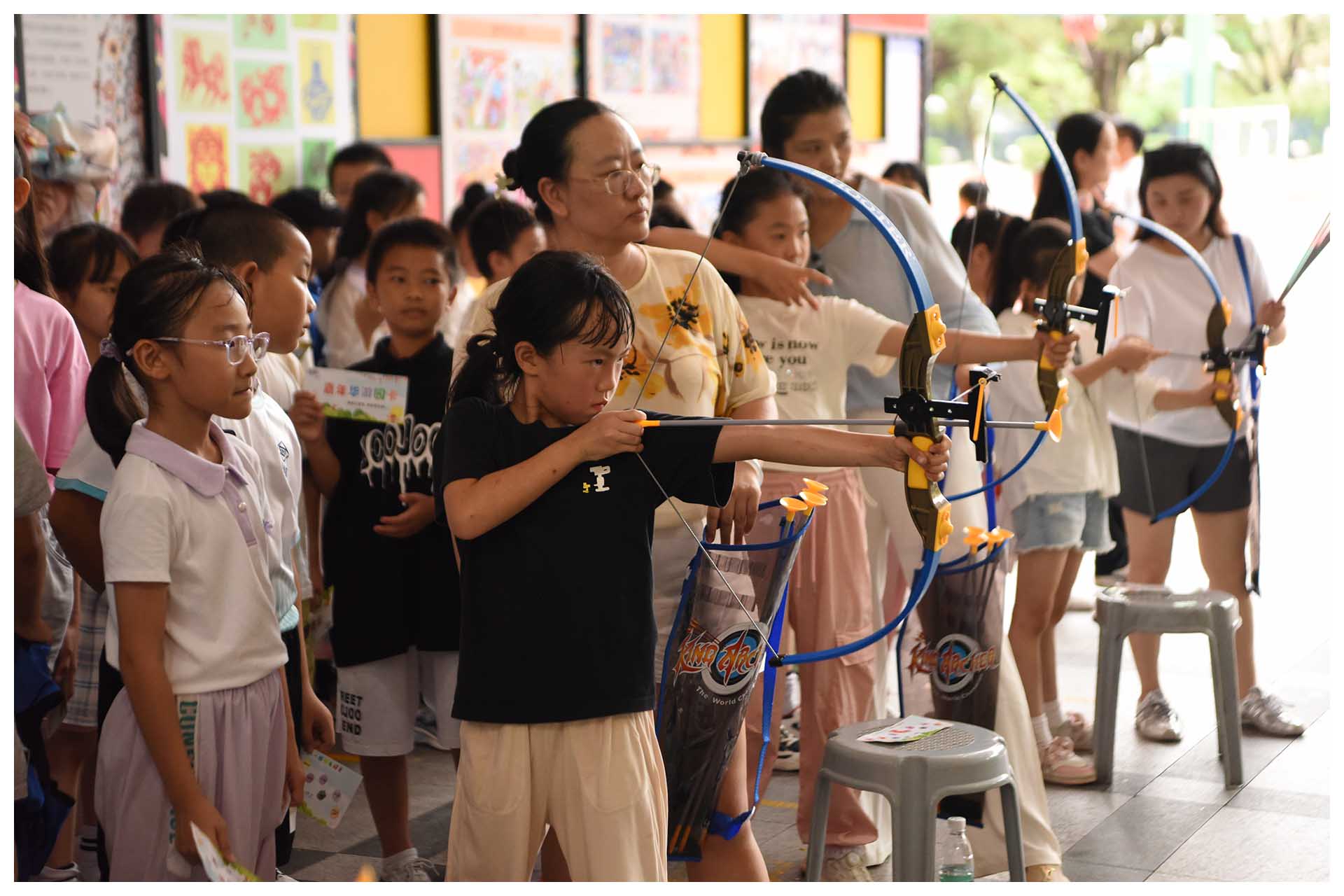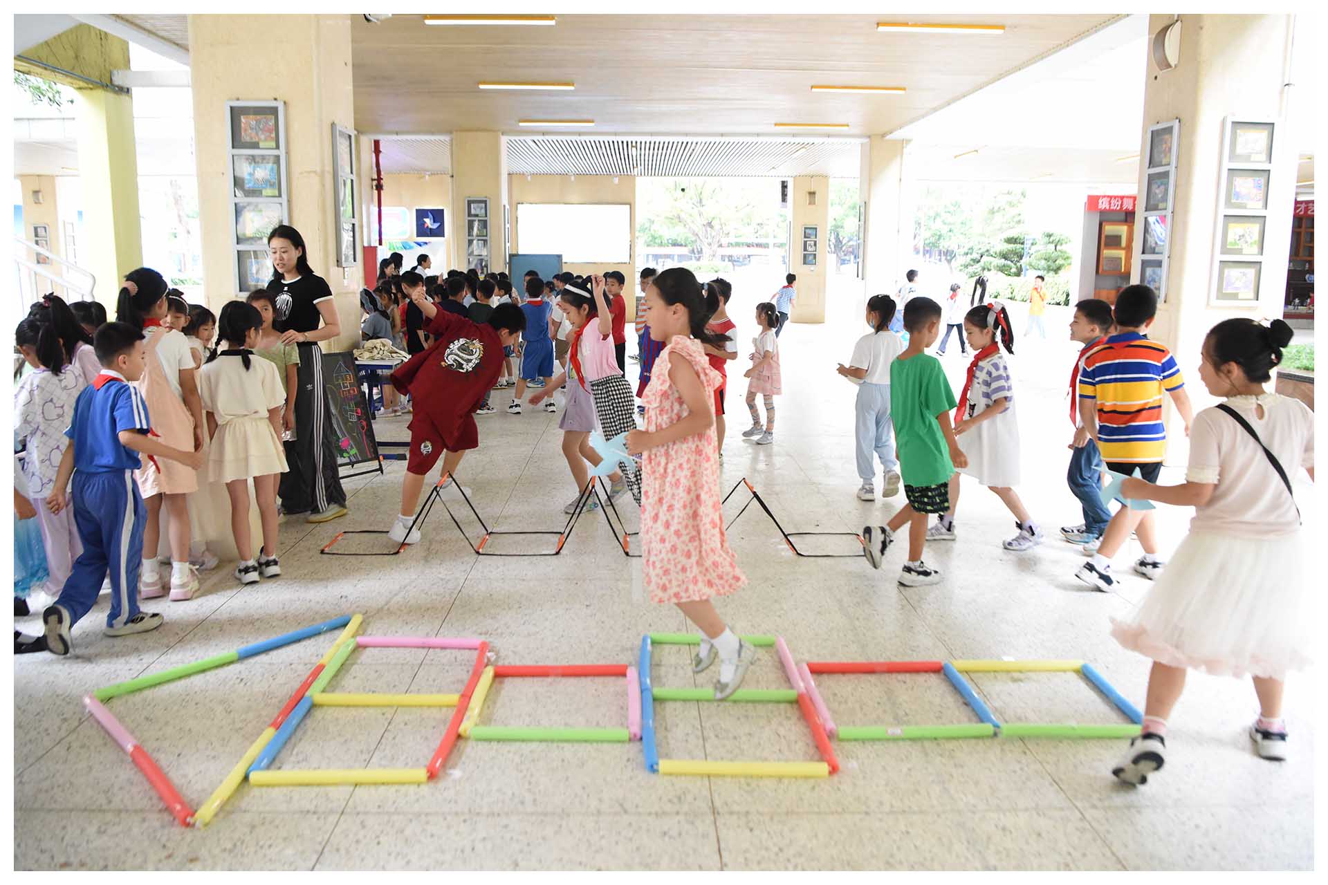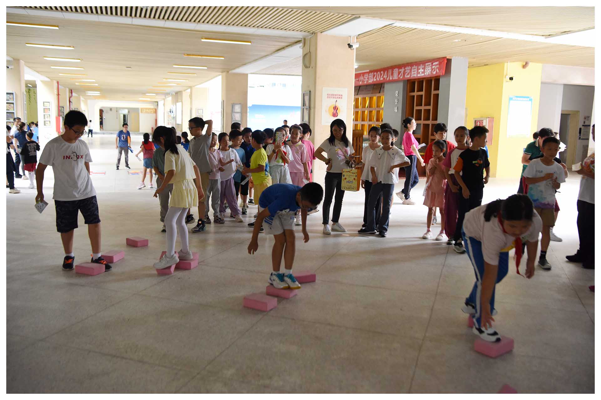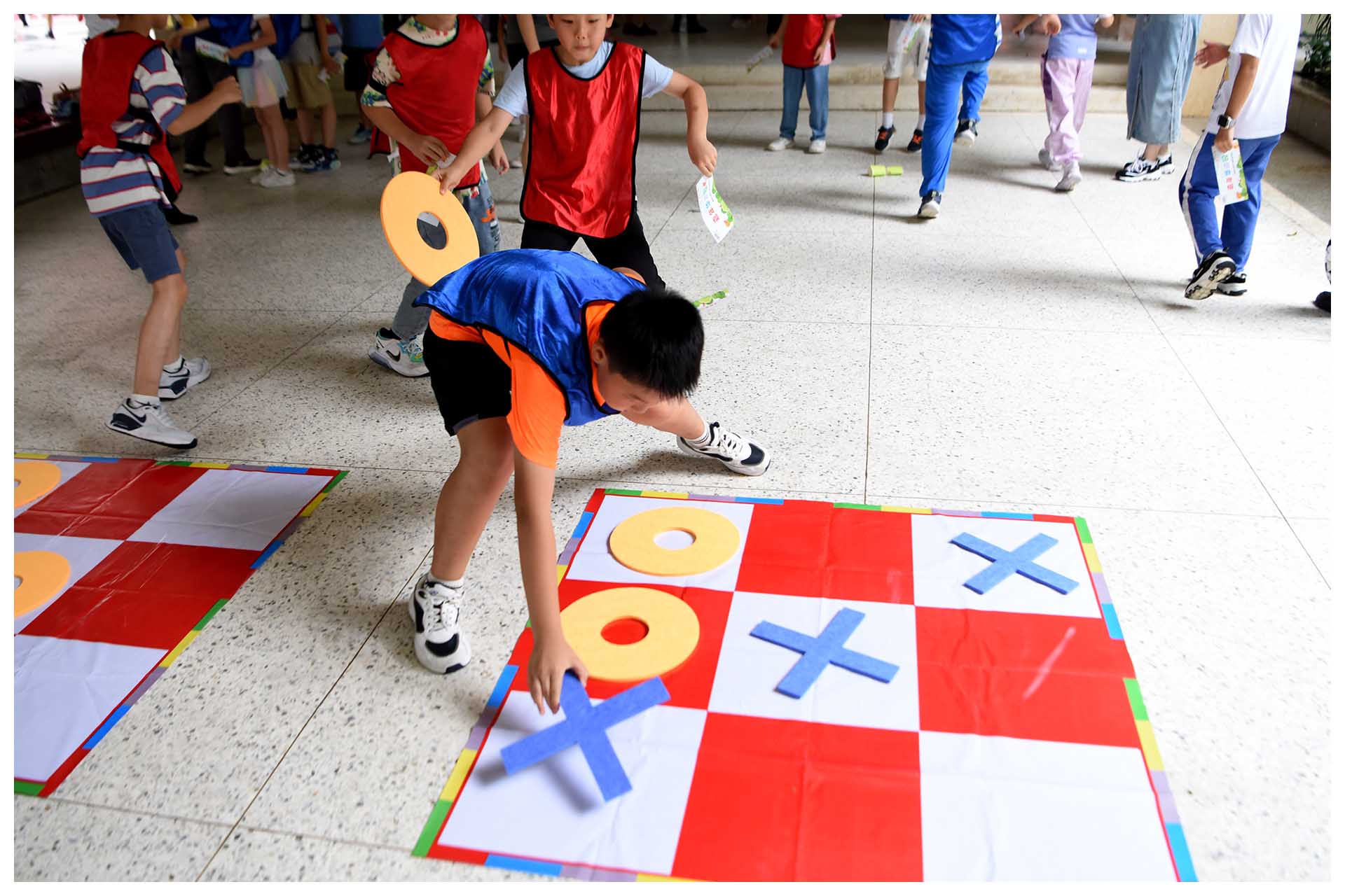 低年级的孩子们进入一楼架空层的游戏区,开始了他们的欢乐时光。“夹玻璃珠大赛”、“打桌面保龄球”、“欢乐跳房子”、“智慧趣味拼图”、“编制端午五彩绳”、“手工DIY干花书签”、“炫彩风车”、“不可思议吸管飞行器”、“吹球大挑战”、“射箭”、“垃圾分类沙包投掷”、“新式套圈”、“巧手投壶”、“探索水拓画之美”、“彩绘曼陀罗心理画”等游戏让孩子们乐此不疲,不仅增进了同学们的互动交流,锻炼了身体协调性,提高了分析问题、解决问题的能力,还培养了团队合作精神,同时也让孩子们了解了传统娱乐方式,在游戏中体验快乐。他们的欢笑声和喝彩声此起彼伏,为活动增添了无尽的活力。