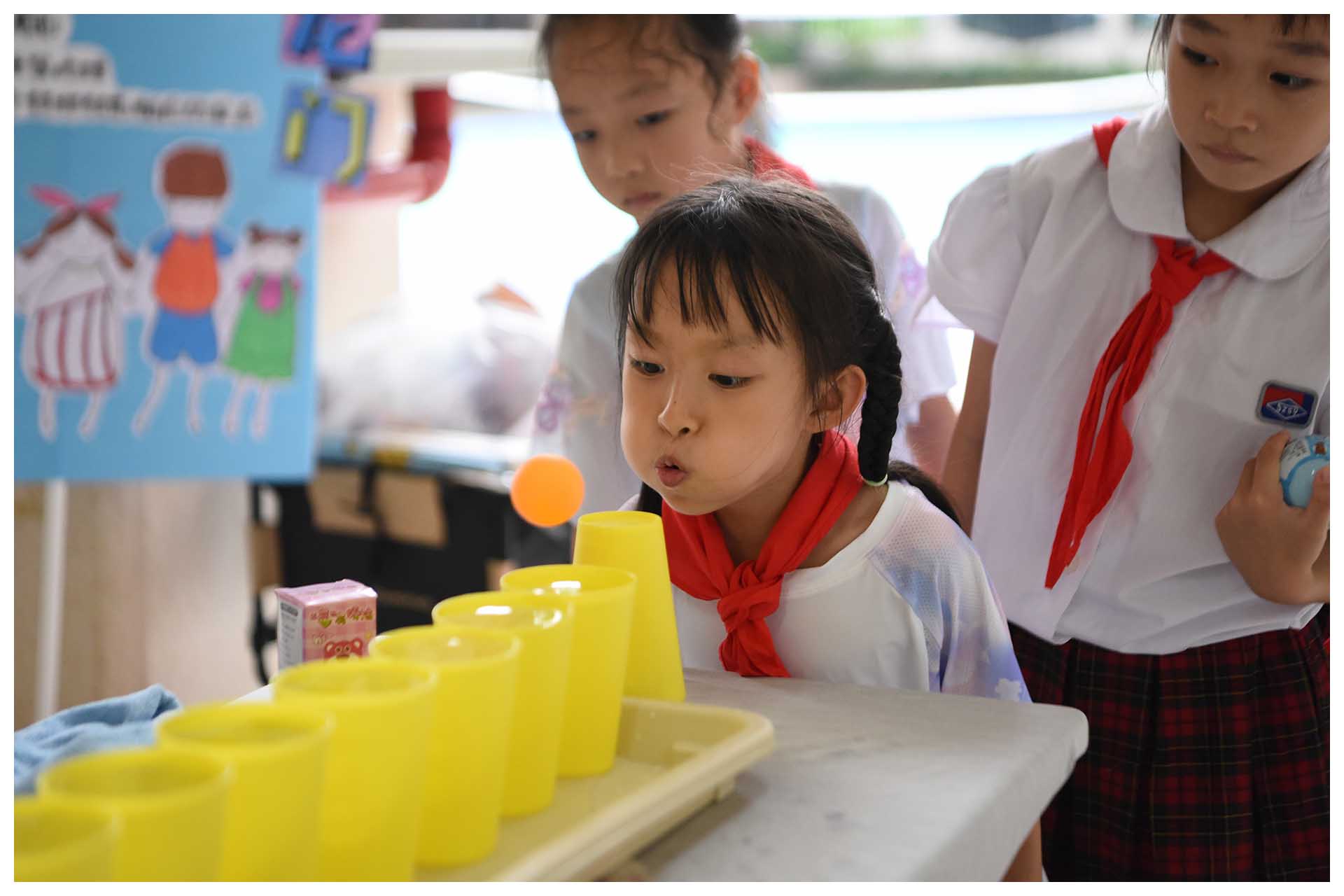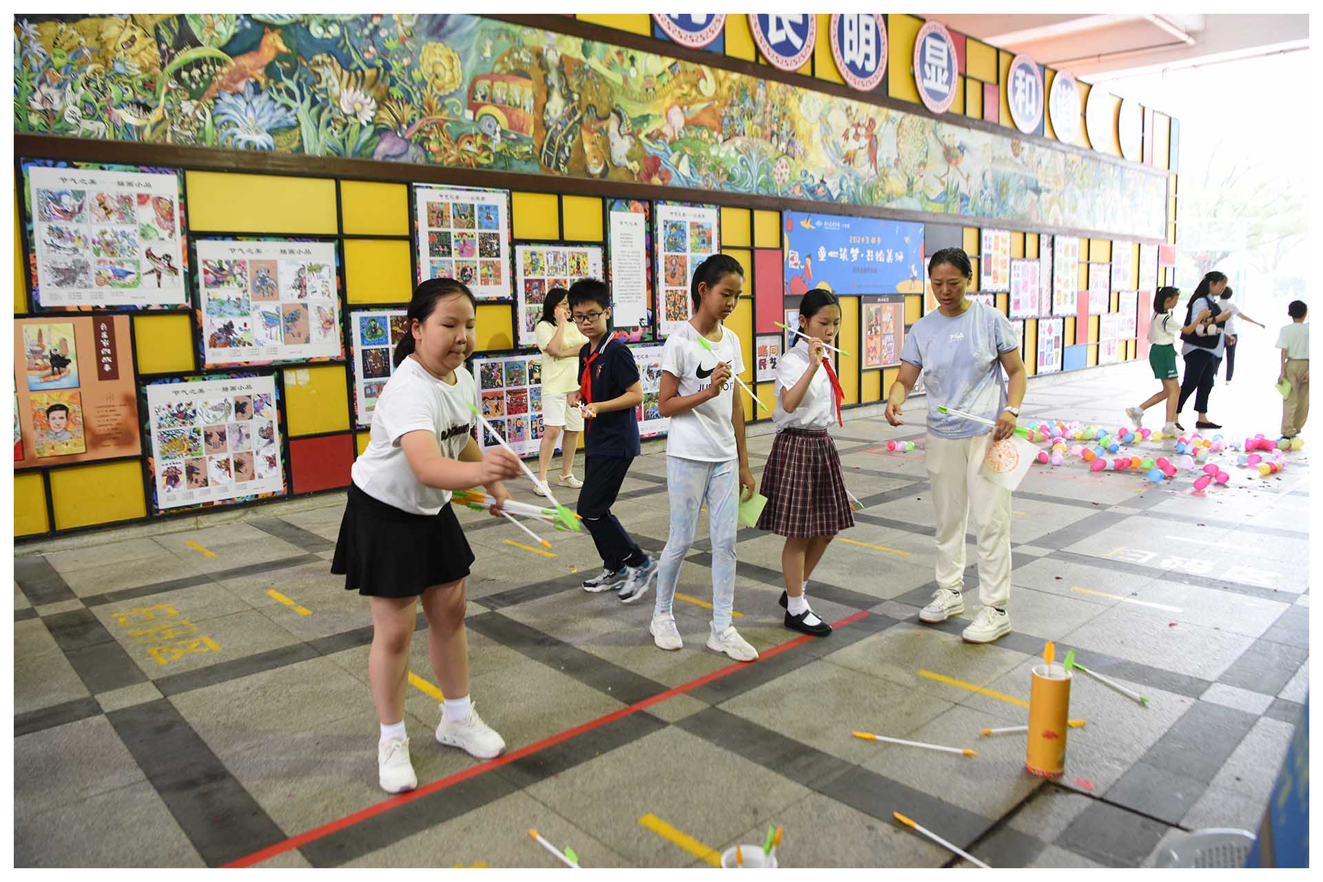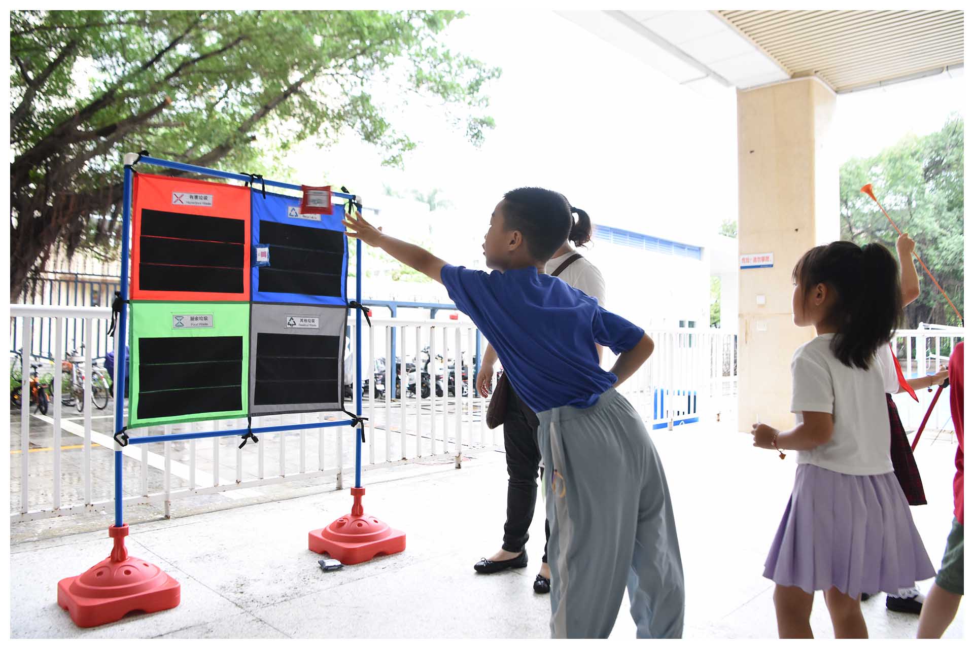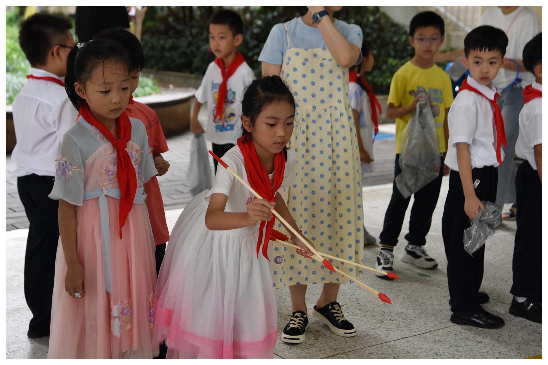 低年级的孩子们进入一楼架空层的游戏区,开始了他们的欢乐时光。“夹玻璃珠大赛”、“打桌面保龄球”、“欢乐跳房子”、“智慧趣味拼图”、“编制端午五彩绳”、“手工DIY干花书签”、“炫彩风车”、“不可思议吸管飞行器”、“吹球大挑战”、“射箭”、“垃圾分类沙包投掷”、“新式套圈”、“巧手投壶”、“探索水拓画之美”、“彩绘曼陀罗心理画”等游戏让孩子们乐此不疲,不仅增进了同学们的互动交流,锻炼了身体协调性,提高了分析问题、解决问题的能力,还培养了团队合作精神,同时也让孩子们了解了传统娱乐方式,在游戏中体验快乐。他们的欢笑声和喝彩声此起彼伏,为活动增添了无尽的活力。