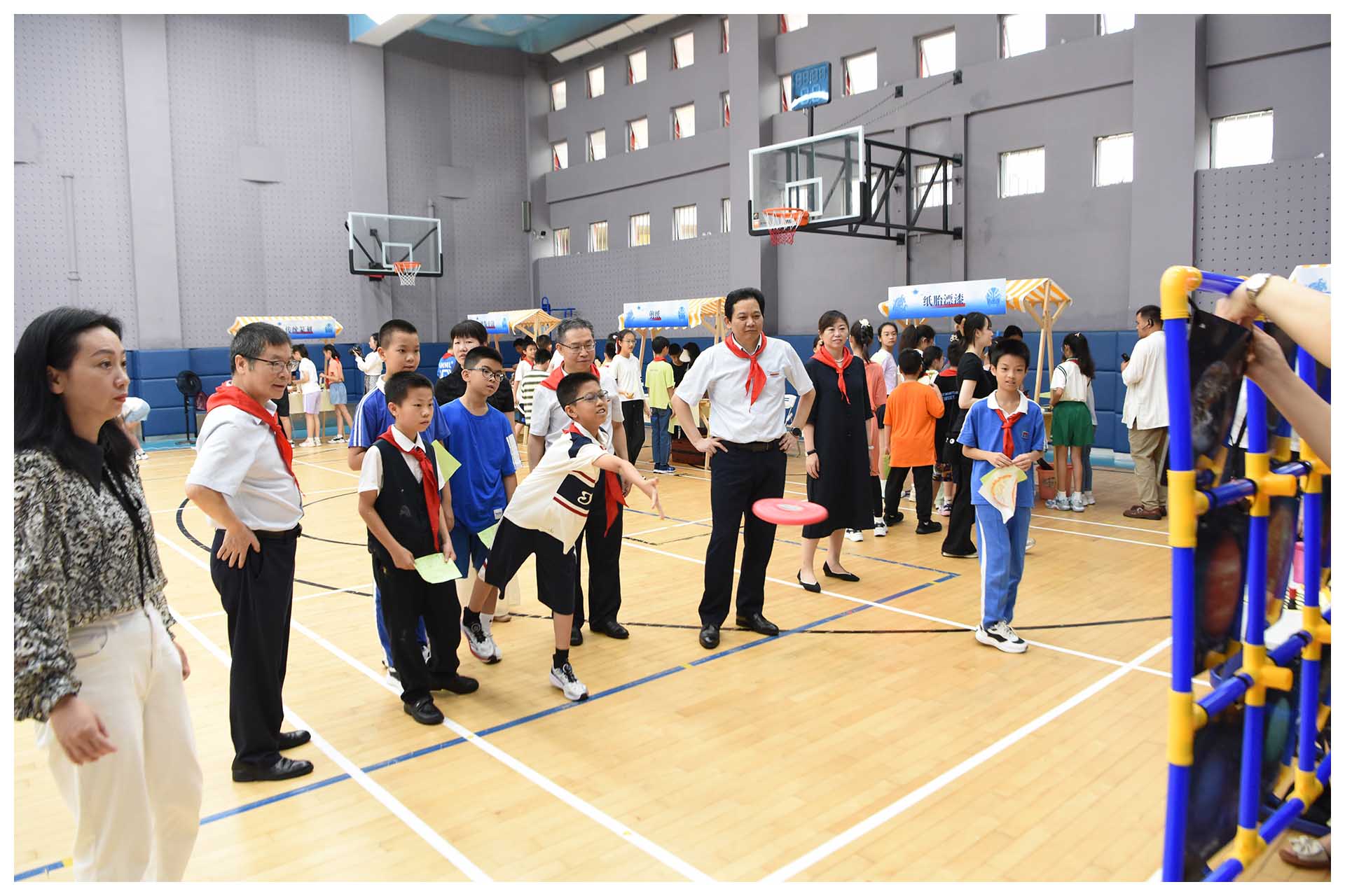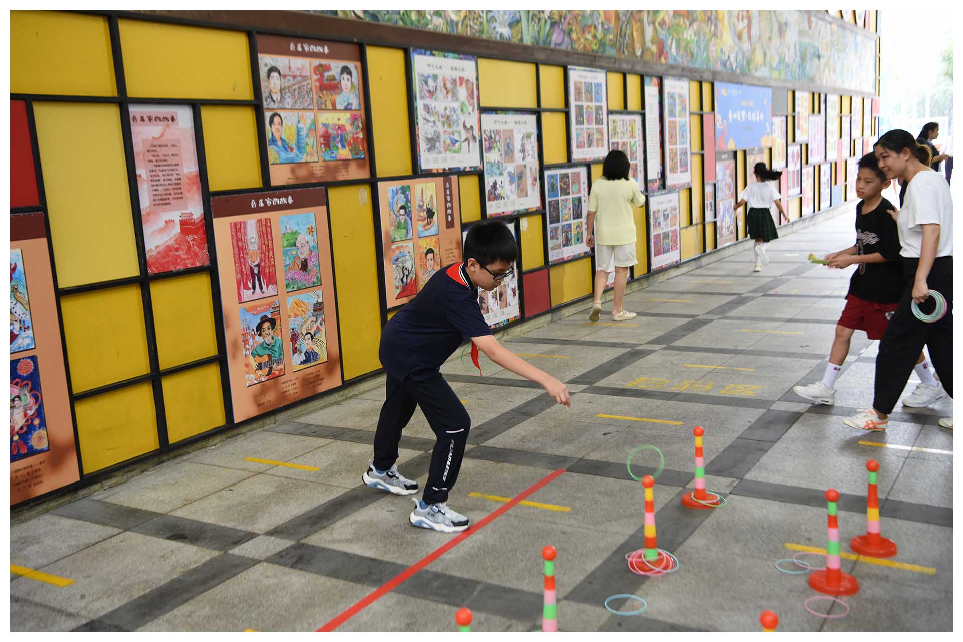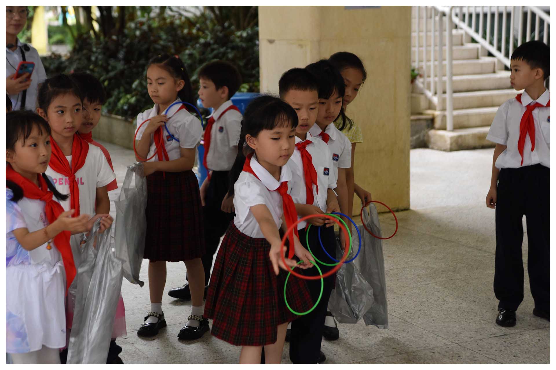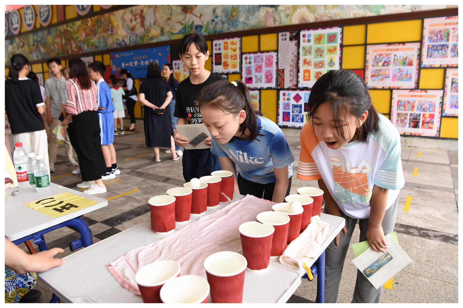 低年级的孩子们进入一楼架空层的游戏区,开始了他们的欢乐时光。“夹玻璃珠大赛”、“打桌面保龄球”、“欢乐跳房子”、“智慧趣味拼图”、“编制端午五彩绳”、“手工DIY干花书签”、“炫彩风车”、“不可思议吸管飞行器”、“吹球大挑战”、“射箭”、“垃圾分类沙包投掷”、“新式套圈”、“巧手投壶”、“探索水拓画之美”、“彩绘曼陀罗心理画”等游戏让孩子们乐此不疲,不仅增进了同学们的互动交流,锻炼了身体协调性,提高了分析问题、解决问题的能力,还培养了团队合作精神,同时也让孩子们了解了传统娱乐方式,在游戏中体验快乐。他们的欢笑声和喝彩声此起彼伏,为活动增添了无尽的活力。