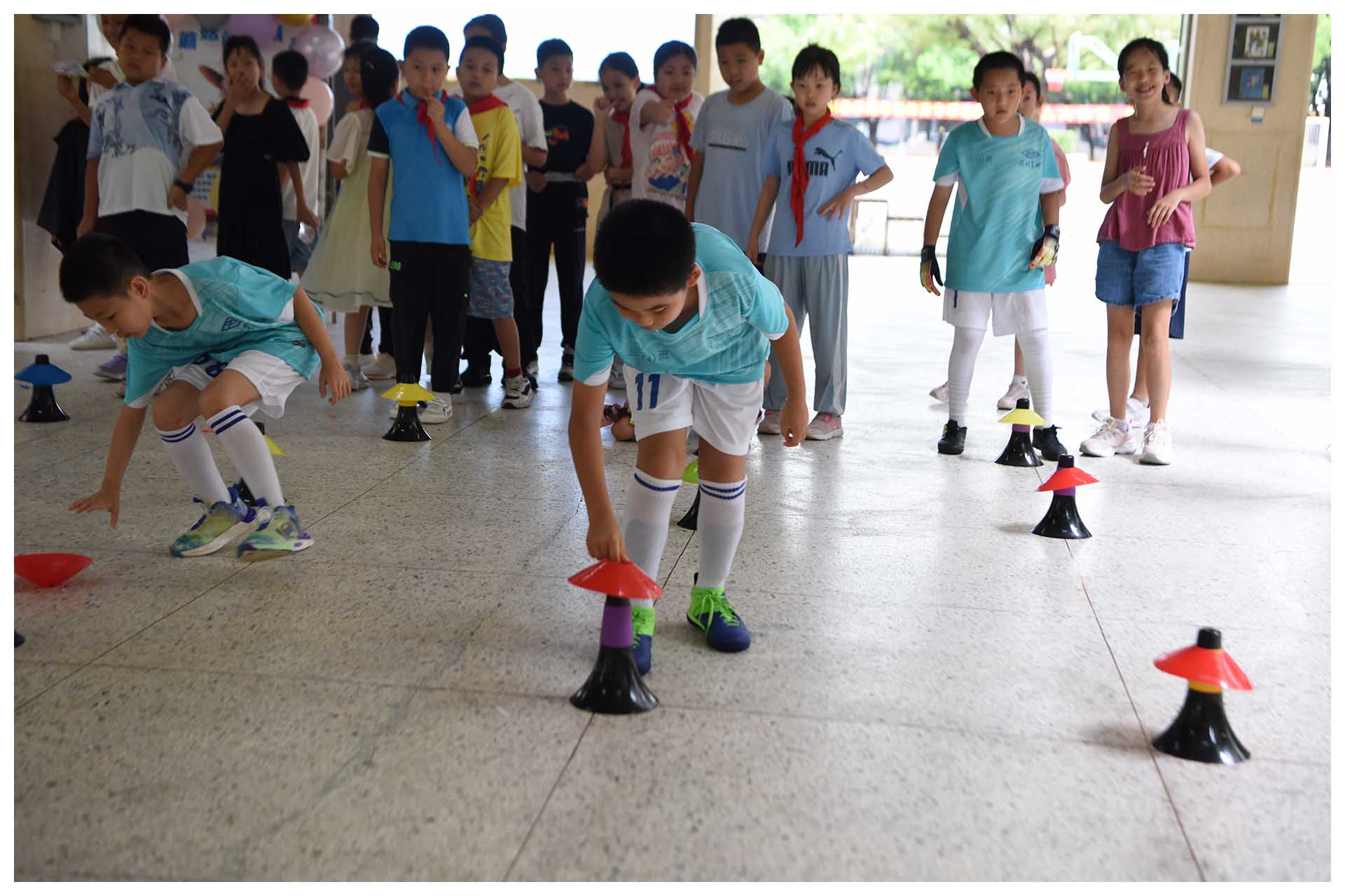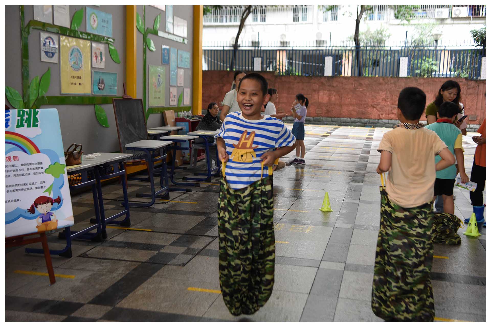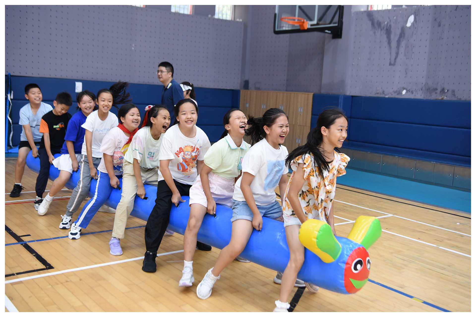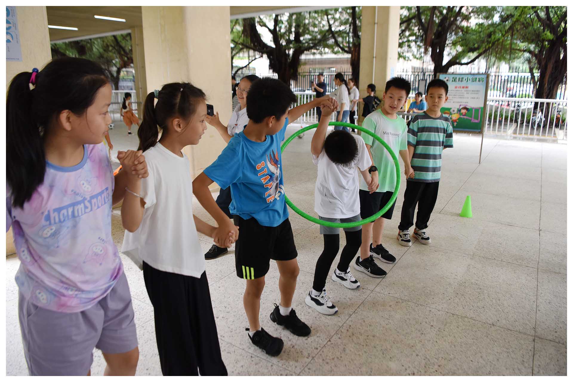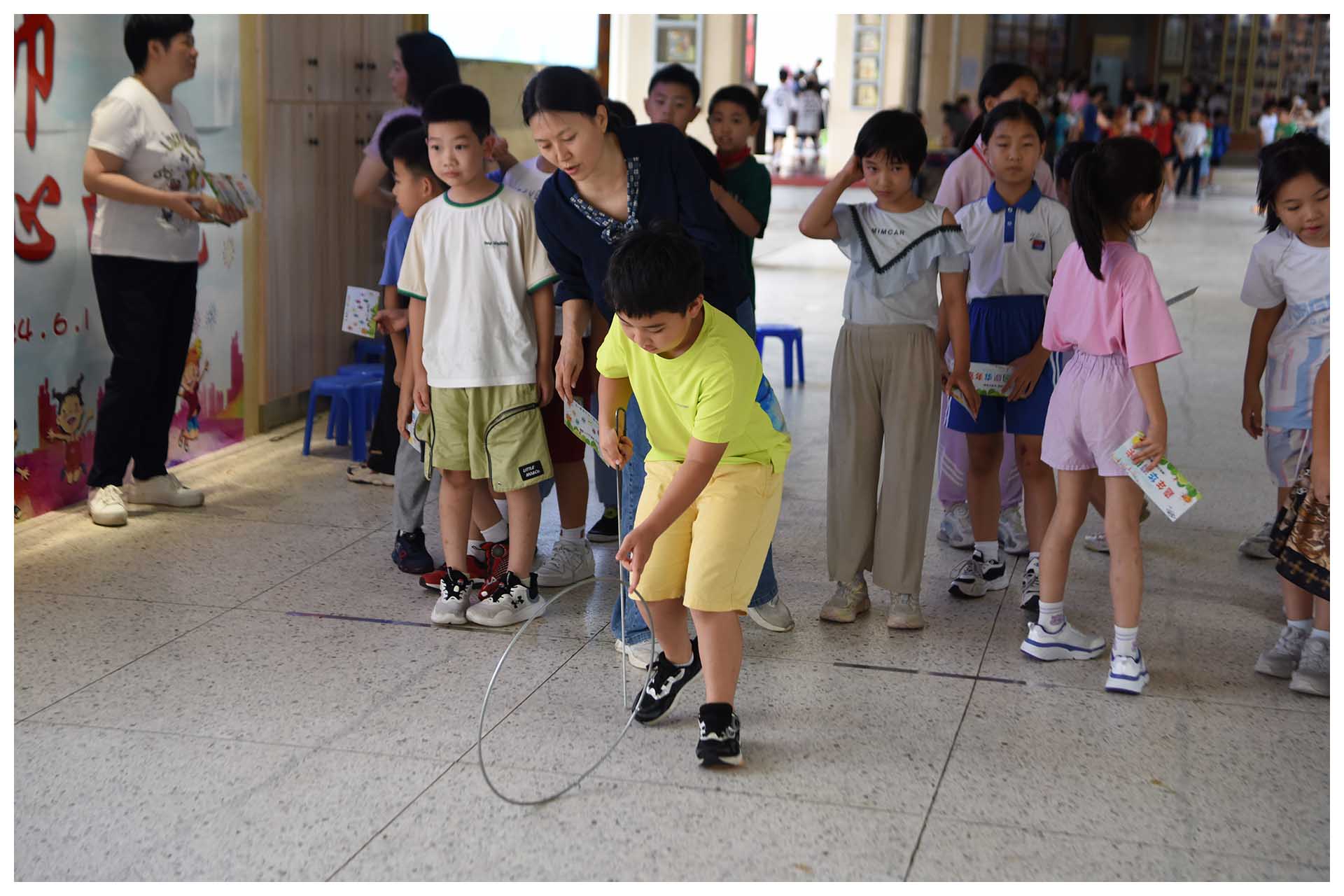 中年级的同学们则带着专属的游园闯关卡来到了一楼长廊和体育馆,他们摩拳擦掌,准备在各类竞技游戏中大展身手。“毛毛虫比赛”、“移砖过河”、“布袋跳”、“滚铁环”、“箭啸江壶”、“射箭奇兵”、“三子棋”、“一圈到底”、“足球小健将”、“采蘑菇的小精灵”等游戏让孩子们尽情释放自己的活力,展现出了团队精神和竞技风采。他们在比赛中不仅锻炼了身体,更增进了彼此的友谊。