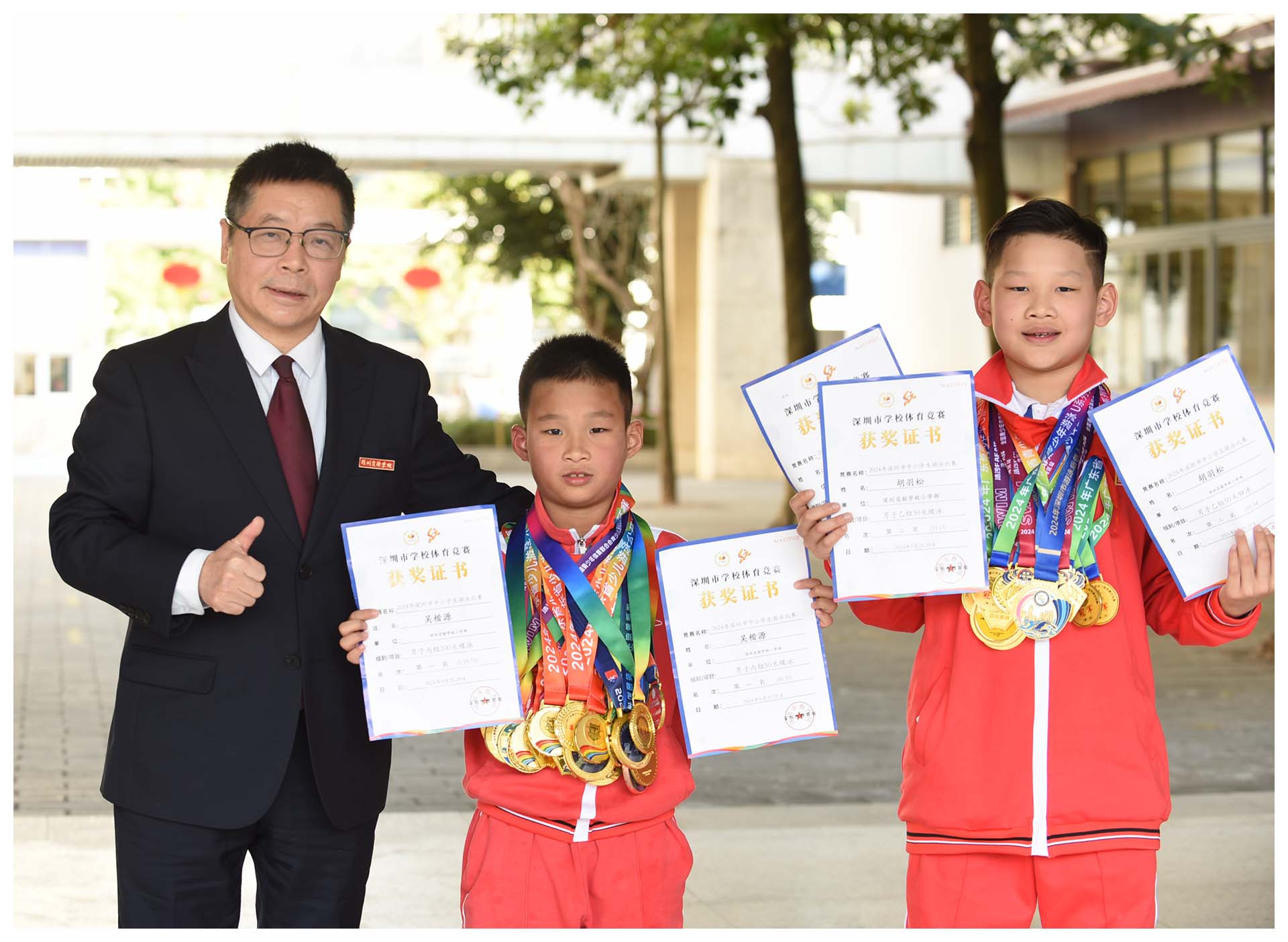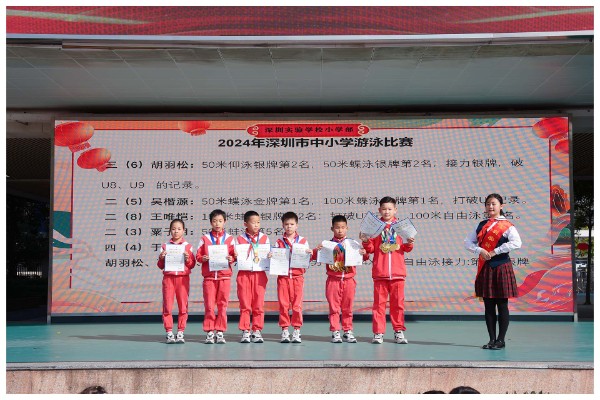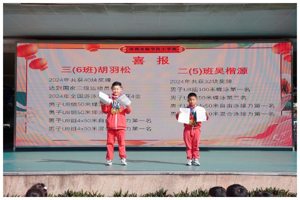 在2024年深圳市中小学游泳比赛中,小学部多位同学登上领奖台,收获沉甸甸的奖牌。其中,三6班胡羽松同学在2024年里,共获40块奖牌并达到国家二级运动员标准;二(5)班吴楷源同学在2024年里,共获32块奖牌。两位同学现都是深圳市队运动员,是深圳市游泳项目的重点培养对象。