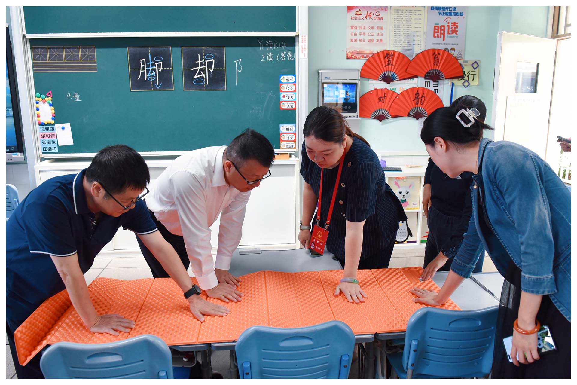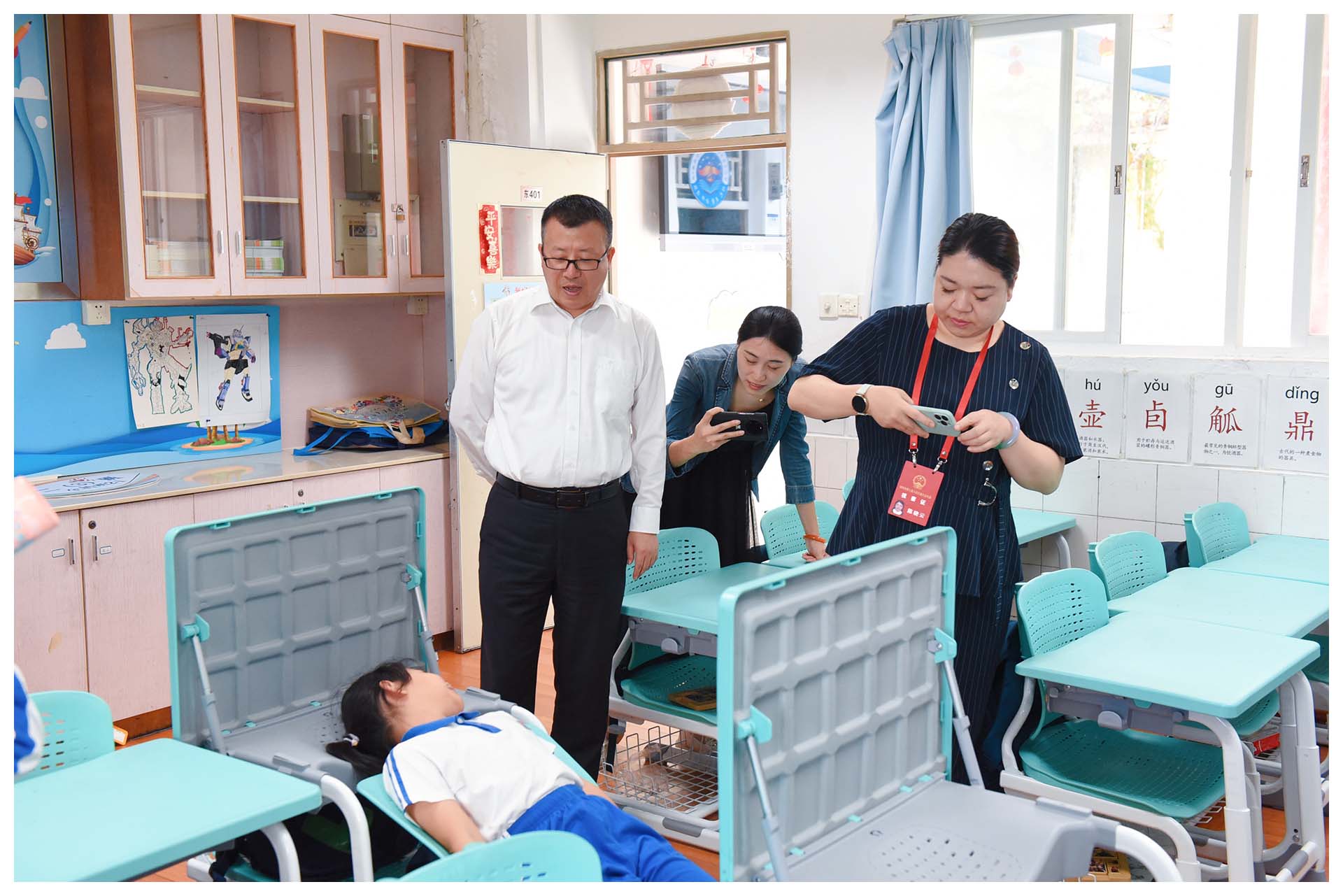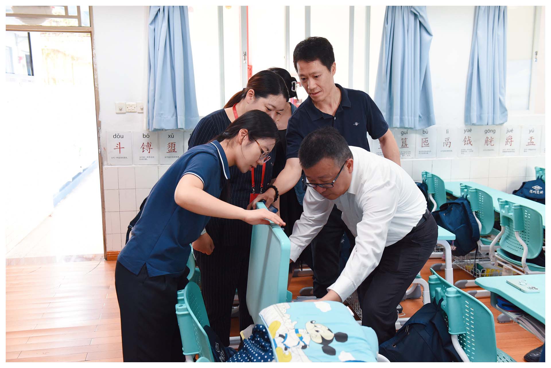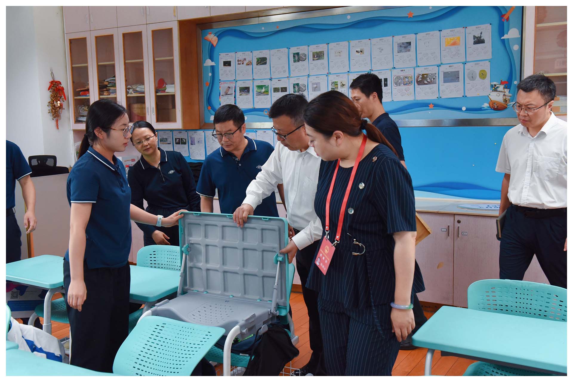 随后,调研团队移步至二8班,实地考察了正在试用的午休课桌椅。班主任朱丽老师和孩子们现场演示了午休课桌椅的功能和使用情况,展现了其在提高午休效率和舒适度方面的优势。吴立新副校长表示,小学部高度重视午休课桌椅的选购工作,已组织开展了多次调研论证,并已将午休课桌椅采购工作列入预算,计划在两年内全部配置到位。