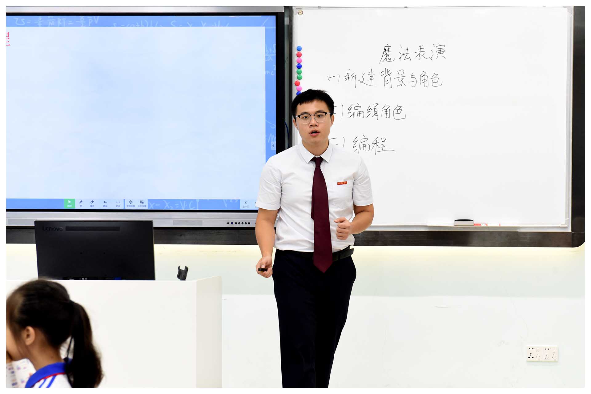 陈嘉劲老师执教五年级《魔法表演》一课。陈老师寓教于乐,以游戏化的方式让学生用图形化编程的方式设计舞台、角色、动作,形成一个人机互动小游戏,呈现了活跃有趣的课堂氛围。市教研员谢莉老师赞扬了青年教师的教资教态以及时间把控意识,认为教学细节把握到位,下课时引导学生保存过程性材料,借助积分评价调控课堂都可圈可点。小学部众多学子在世界机器人大会等赛事中脱颖而出,共有9位学生被评为深圳市2023年度科创之星。