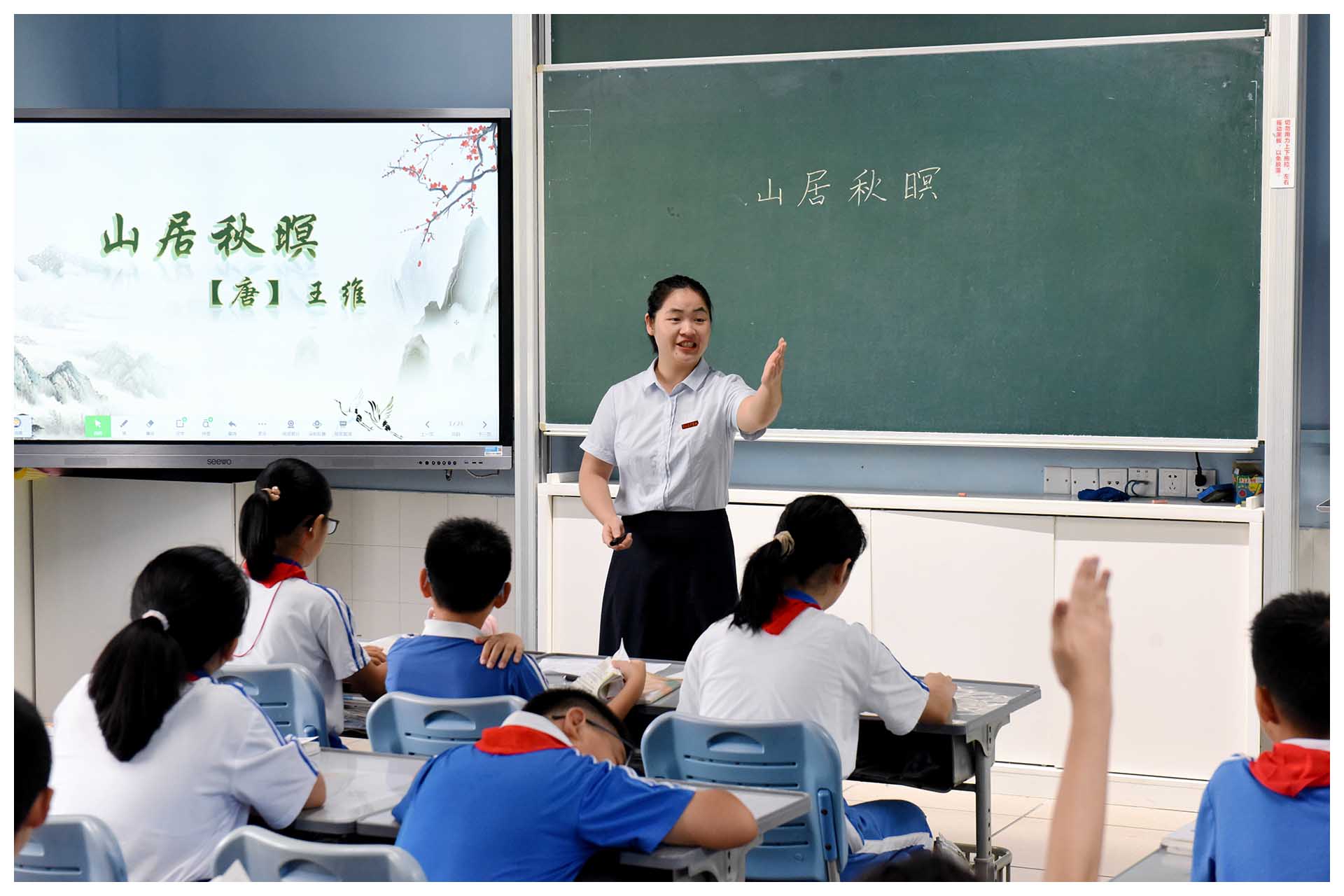 刘洁雅老师执教古诗《山居秋暝》。本课教学以吟诵为引,带领学生感受终南山的“静”,感悟“以动衬静”的笔法,诠释王维诗中“空”的境界。市教研员白皛老师评课时赞扬了刘老师诗教课堂的设计层次清晰,提供资料讲究“最佳内容”“最佳时机”“最佳效果”。平仄朗读要教学生知其然,亦知其所以然。要给学生搭建支架,实现有层次的理解。小学部语文学科是深圳市“诗教示范校”的试点科组,在诗教课堂、语文周诗教活动等领域深度耕耘,行稳致远。