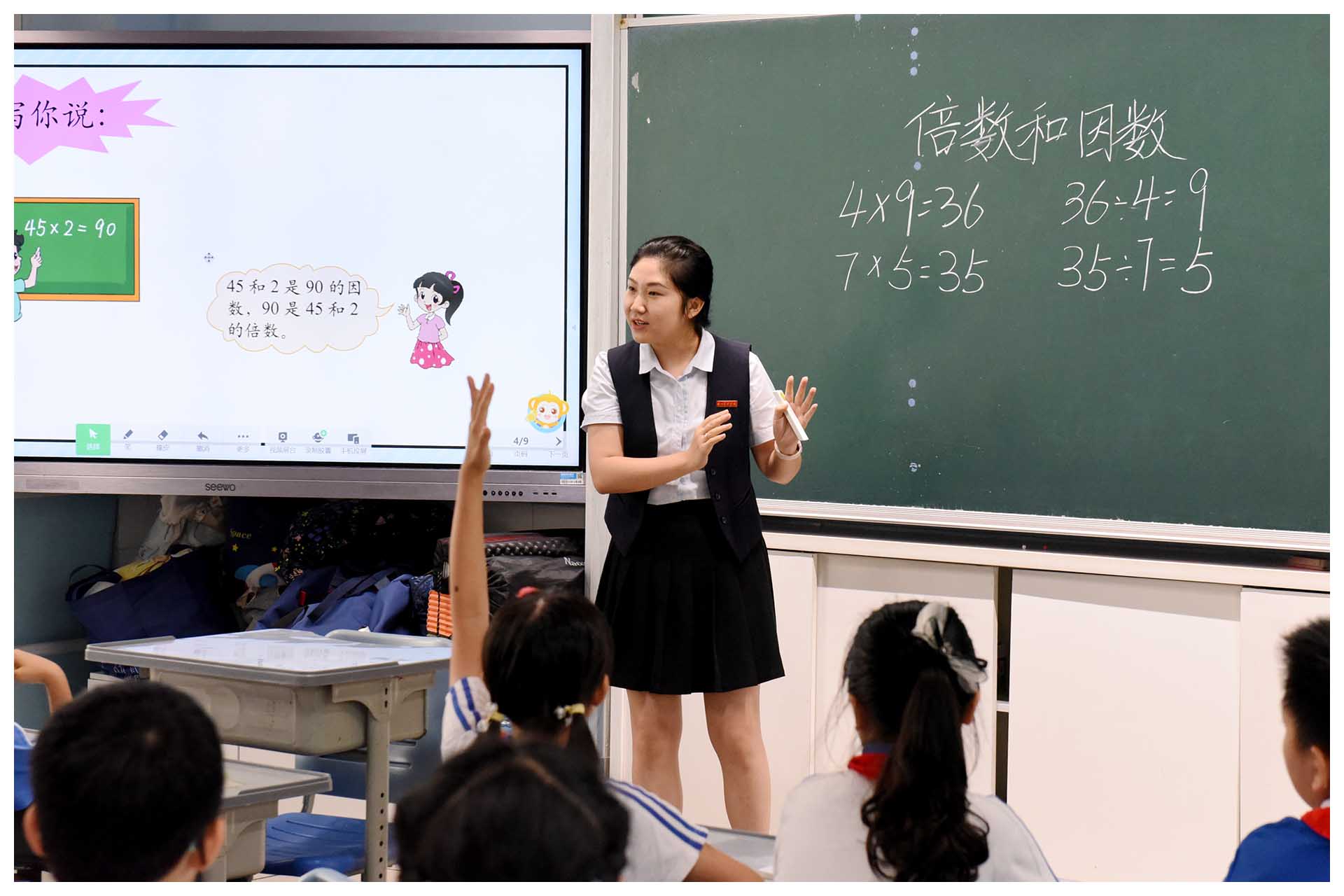 栾莹焮老师创设了“体育节”情境,借点子图和对应算式,揭示课题“倍数与因数”。学生在理解倍数、因数含义的同时,习得找一个数的倍数和因数的方法。市教科院李一鸣老师和王开杰老师称赞栾老师教态亲切自然,教材把握到位,教学情境真实。小学部数学学科注重学生数学方法的习得与数学意识的建立,通过自主学习、合作探究等方式,打造以学生为主体的生本高效课堂。