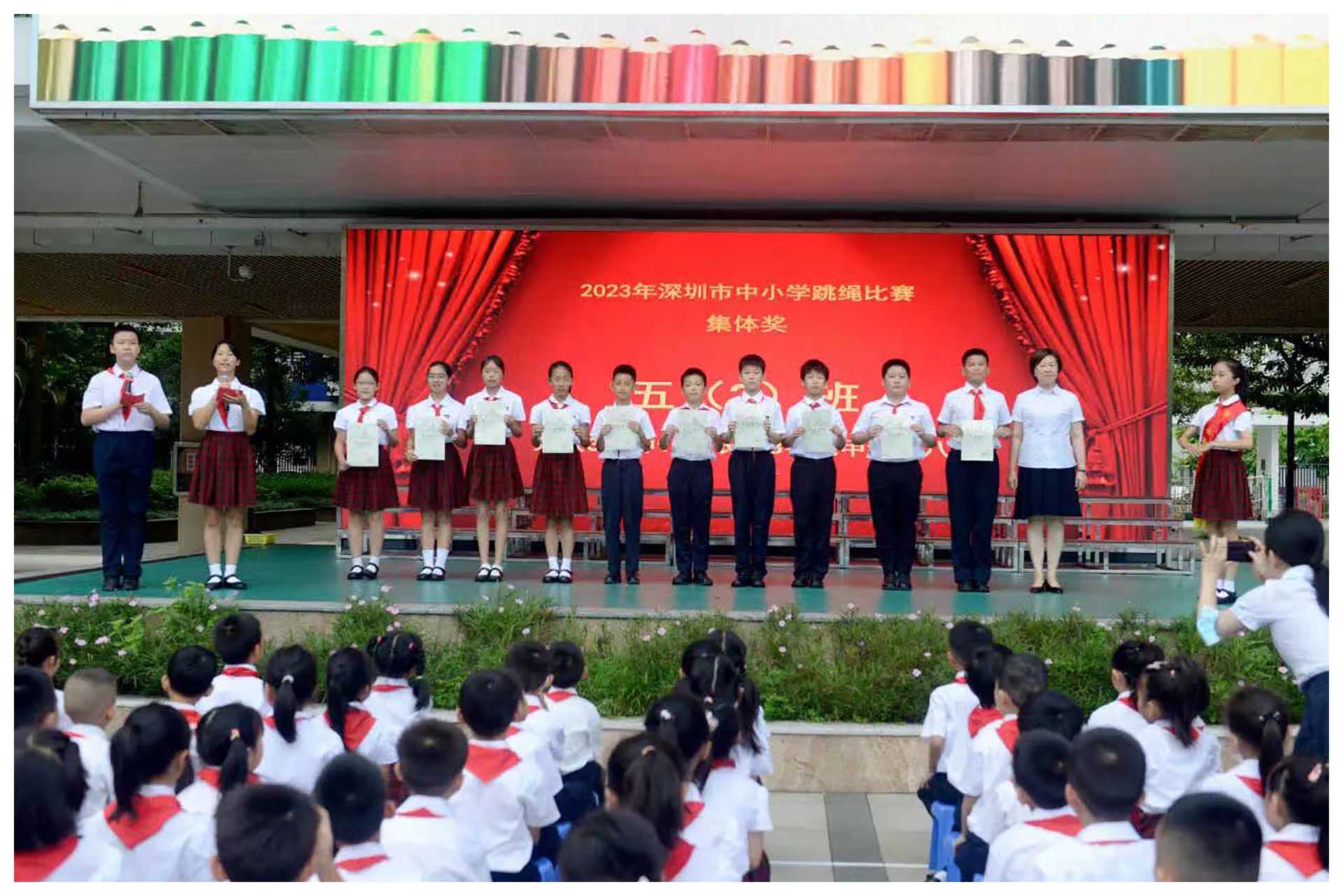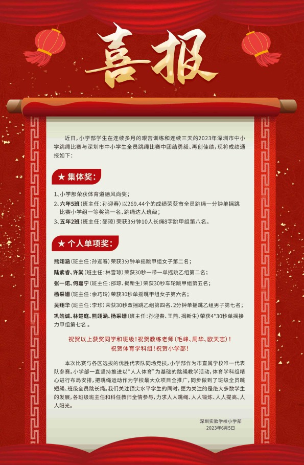 6月,小学部学生经过连续多月的艰苦训练,在连续三天的2023年深圳市中小学跳绳比赛与深圳市中小学生全员跳绳比赛中团结勇毅、再创佳绩,成绩如下: