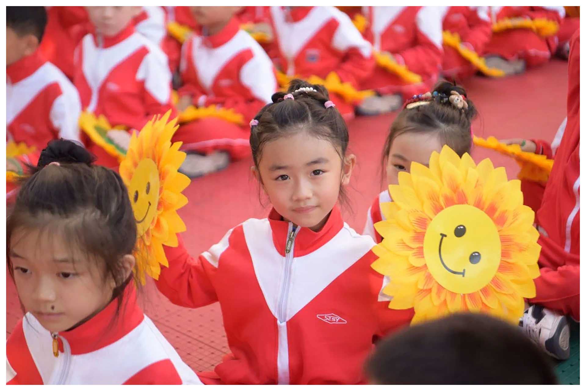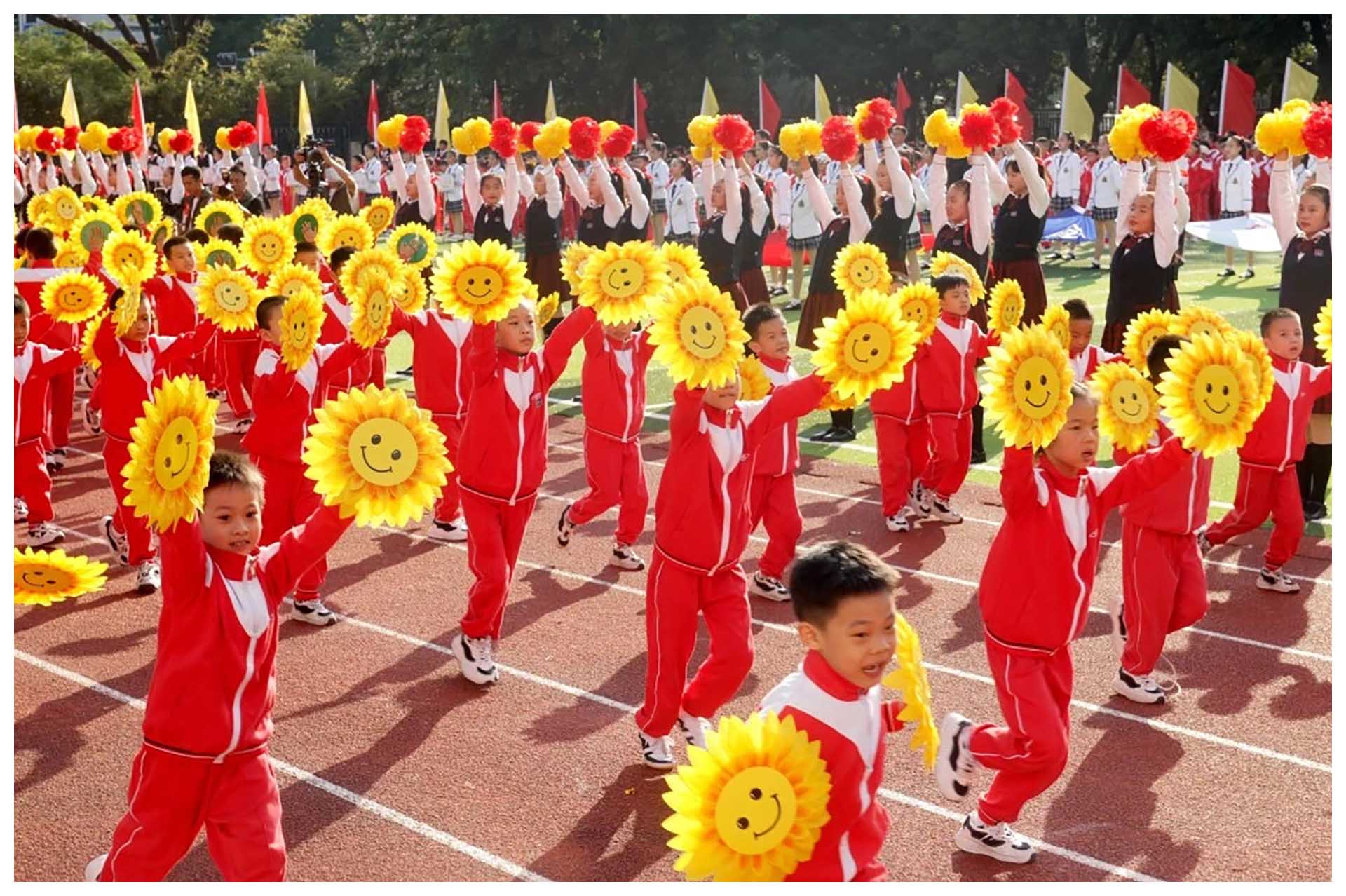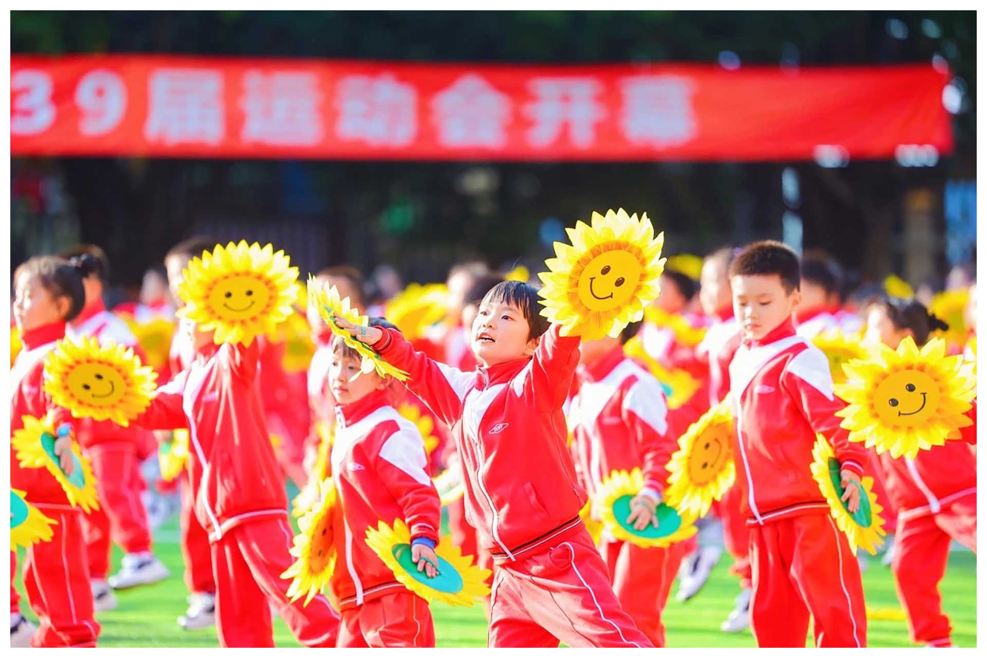 三声浑厚悠扬,九声清脆激越的实验钟声之后,深圳实验教育集团夏育华书记宣布运动会开幕。顿时,礼花齐鸣,缤纷绚烂。一年级小朋友欢呼着跑过主席台,葵花朵朵,笑脸洋溢。