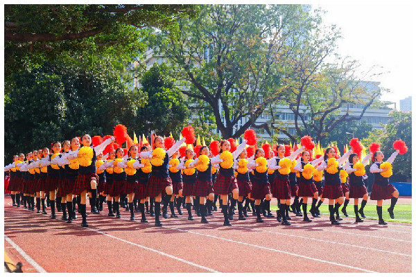 由六年级女生组成的花队手持红、黄花球,笑容灿烂,激情满怀。旌旗猎猎,迈步踏踏,彩旗队手擎旗帜,朝气蓬勃地展现着最高年级的风采!