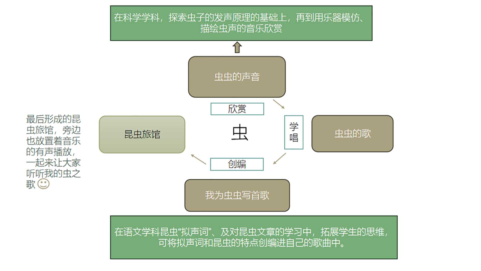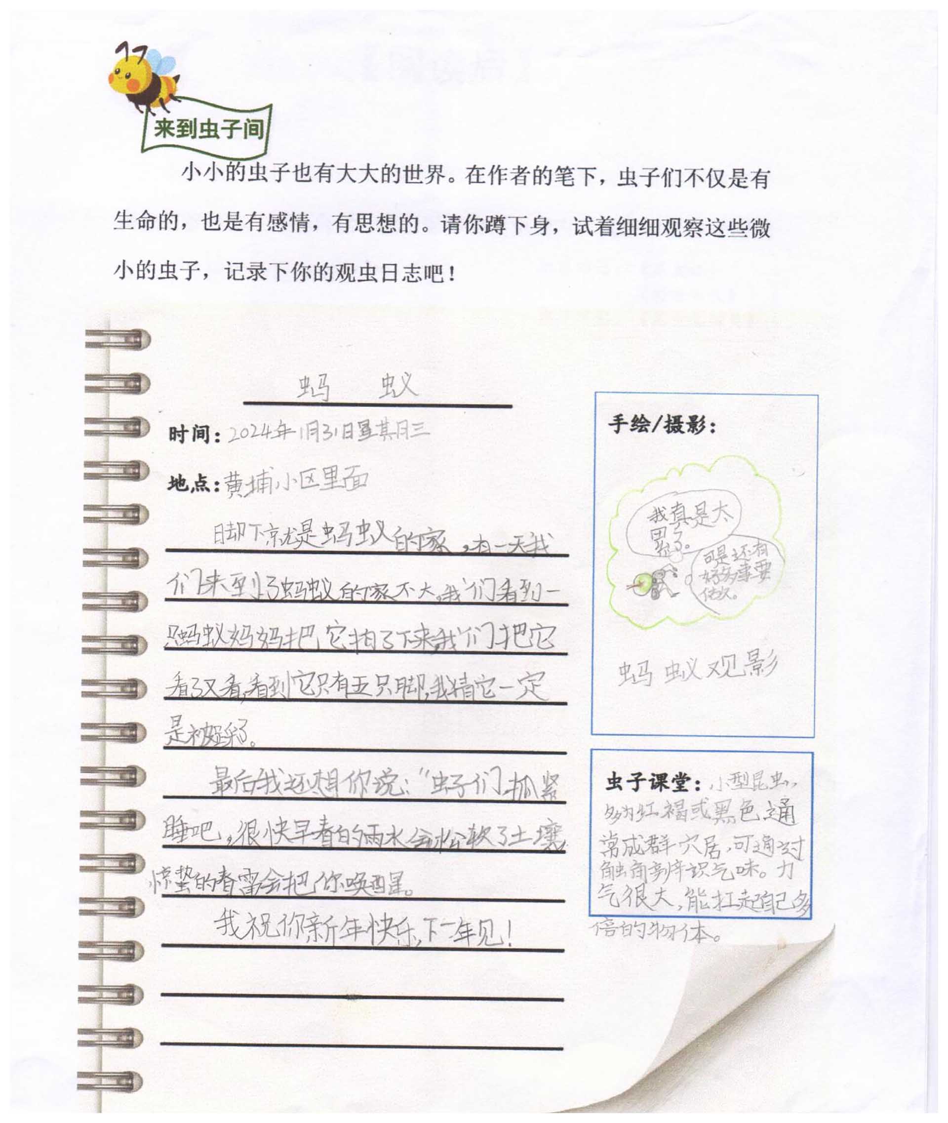 姜浪老师根据年级的“虫”主题课程,以“我的昆虫朋友旅馆”为载体,将数学知识与昆虫知识相结合,引导学生设计、制作昆虫旅馆,在实践活动中学习数学知识,培养学生的动手能力和创新思维;从教30余年的徐莉英老师虽已临近退休,却仍热情投入其中,在全科之前的课程实践上有承袭有创新,设计了“我的昆虫朋友”语文跨学科主题课程。从认识身边的昆虫出发到探索昆虫的秘密,从许下领养承诺到记录观察日记,实现了与虫虫的亲密互动;胡诗琪老师结合年级的虫养殖活动,以“虫之歌”为主题,带领学生从音乐的角度走进昆虫的世界,通过聆听、演唱、创作等音乐活动,感受昆虫的形态、习性和声音,激发学生的音乐想象力和创造力。