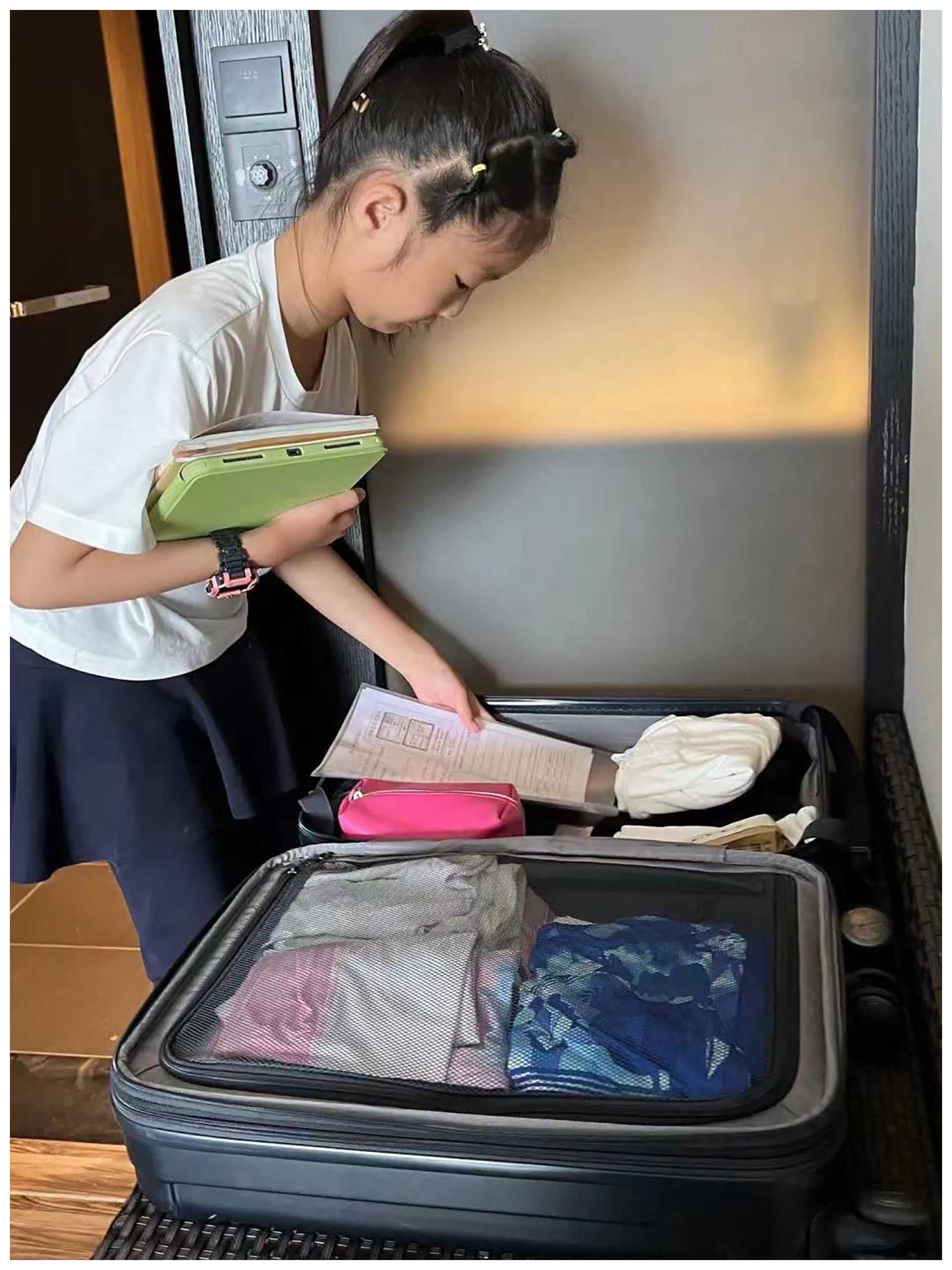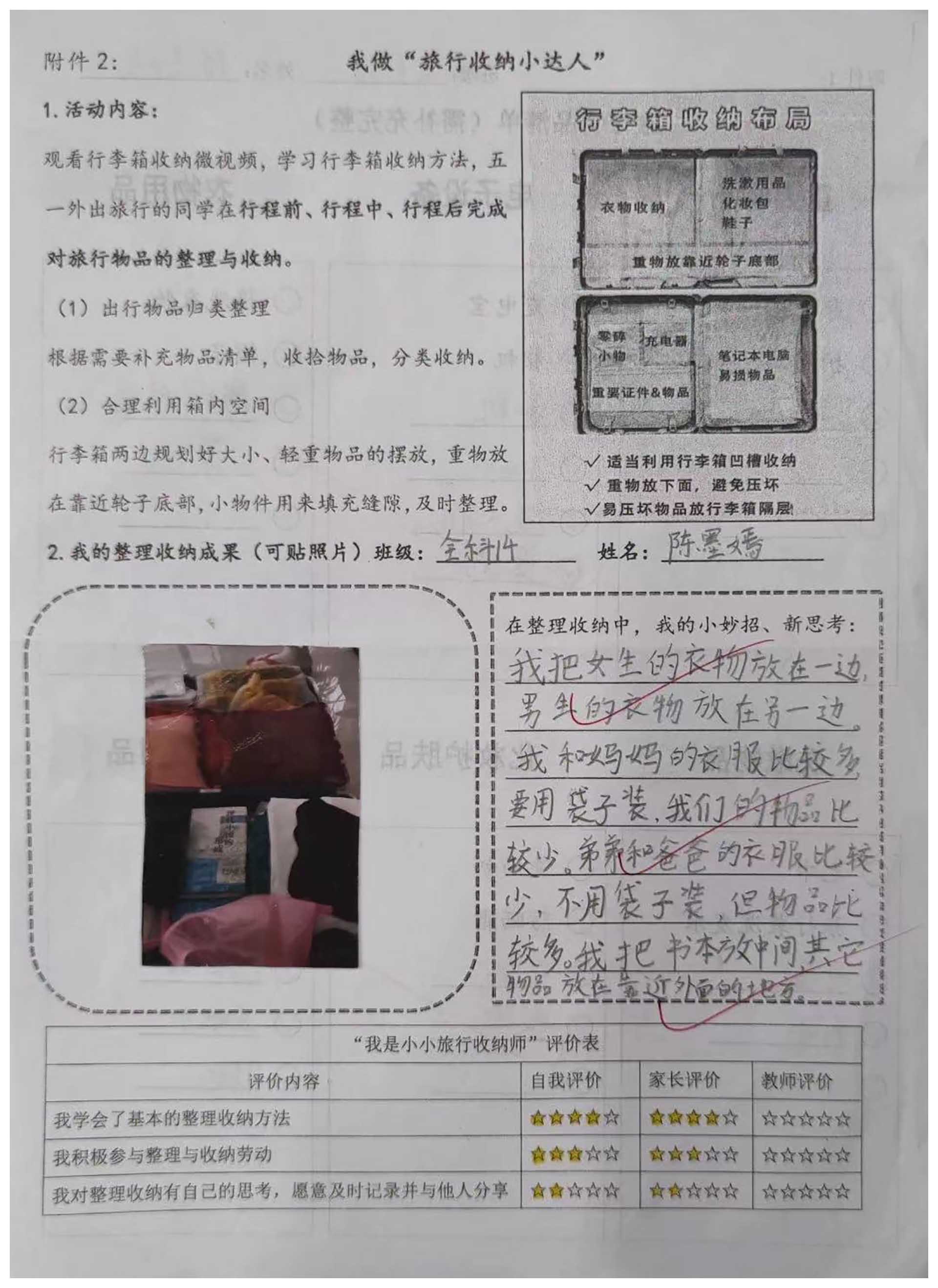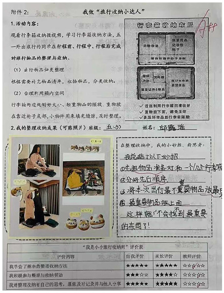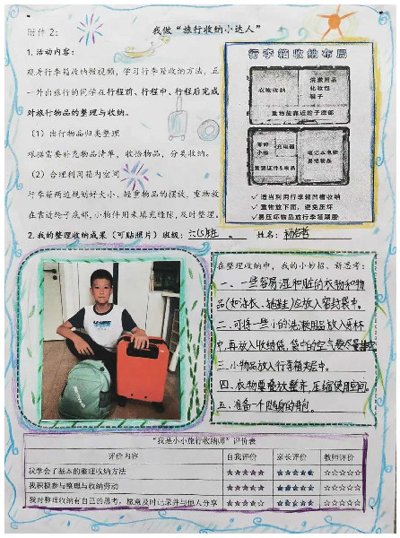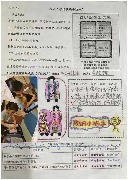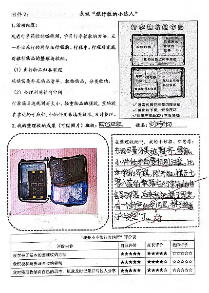 “五一”外出旅行的同学,自学了行李箱物品的整理收纳方法,并利用物品清单在行程前、行程中、行程后及时对物品整理归纳。