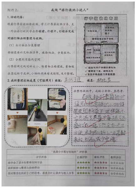 居家休息的同学,也积极练习着整理收纳。一到三年级的同学们自主完成房间物品的整理与收纳。四到六年级的同学们则尝试完成自己房间物品和家庭公共区域物品的整理与收纳。同学们和家长一起学习、探讨整理与收纳的技巧,并及时记录小思考、小妙招。