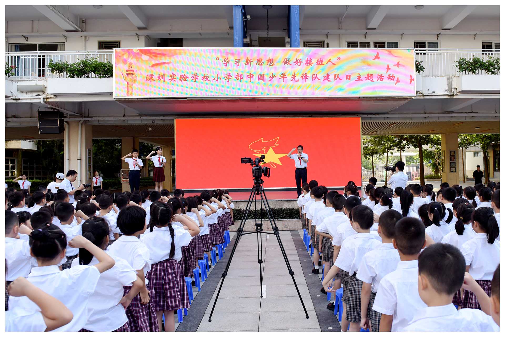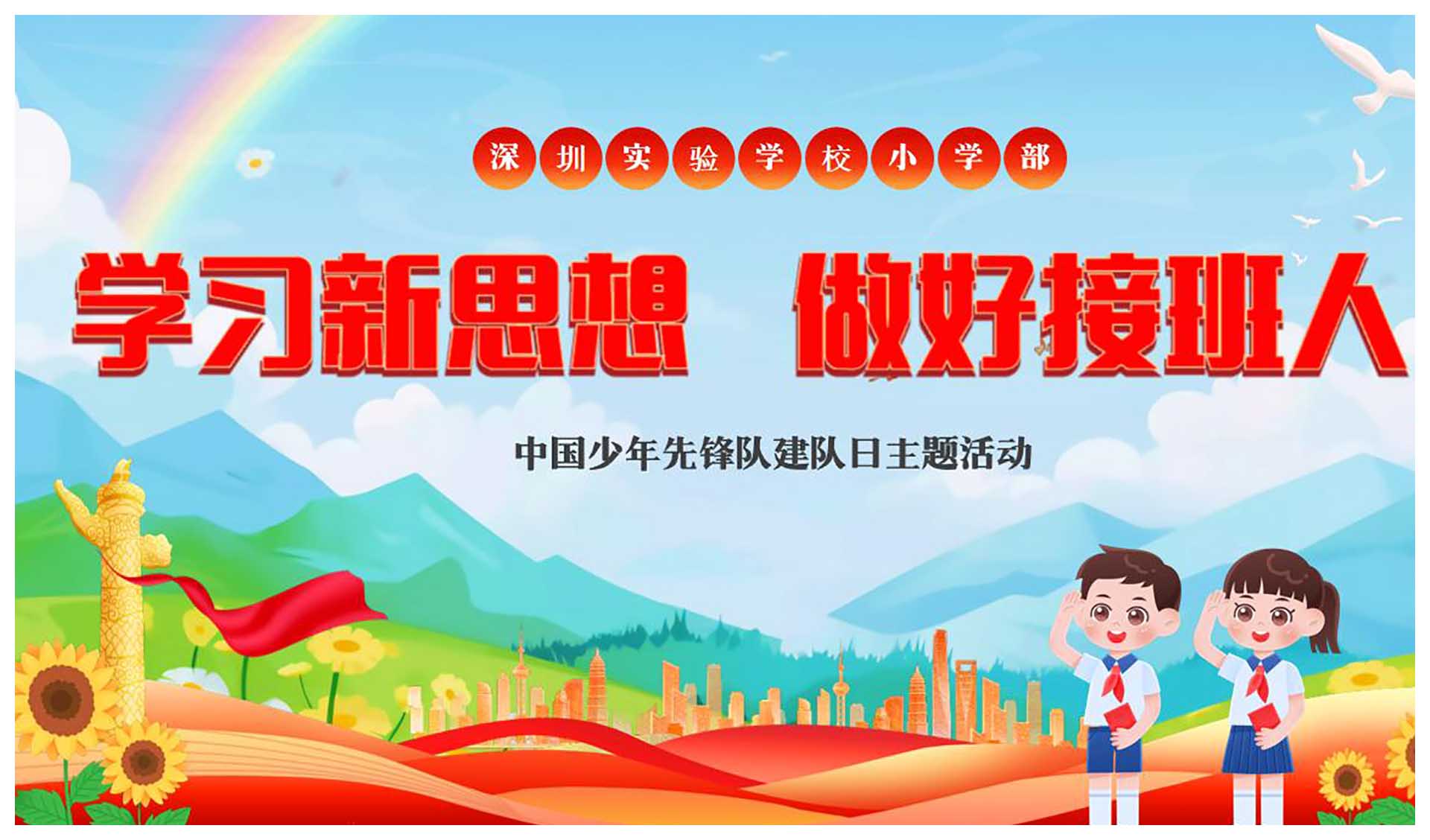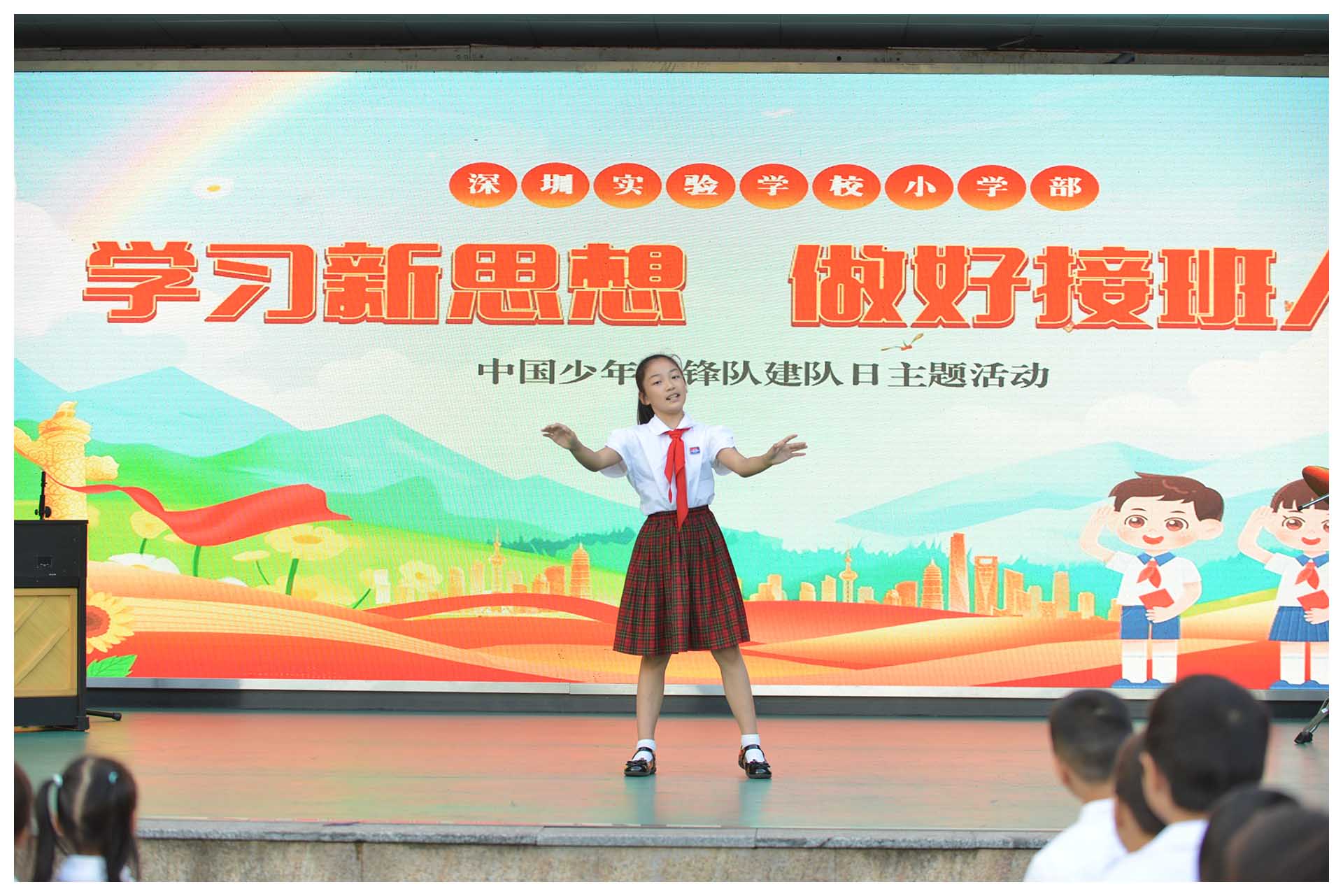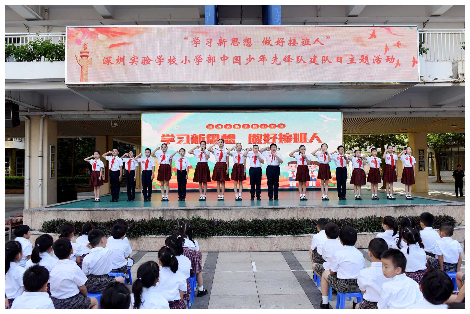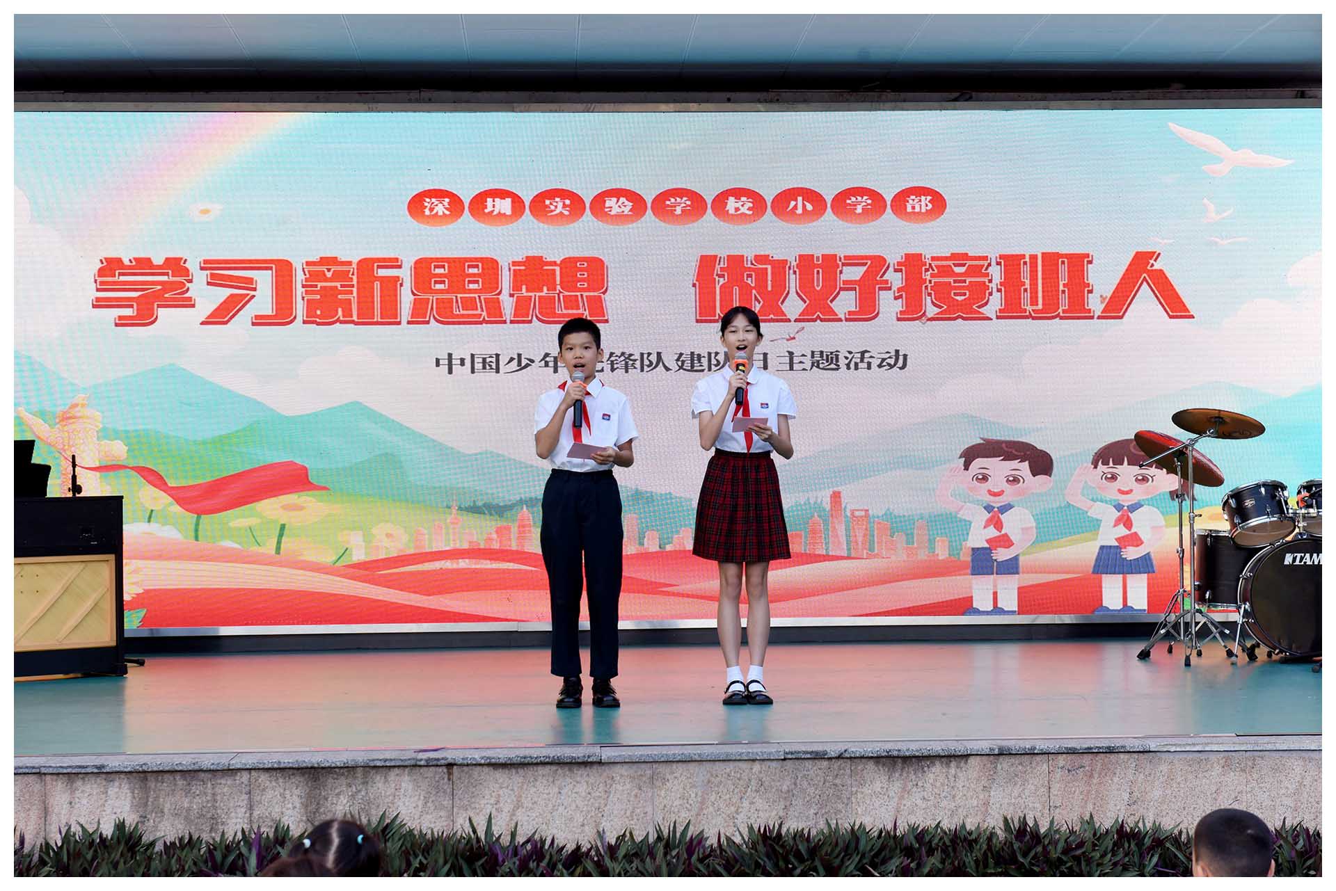 深圳实验学校小学部围绕中国少年先锋队建队75周年主题,开展“学习新思想,做好接班人”中国少年先锋队建队日主题活动,教育引导广大少先队员牢记习近平总书记的教导,坚持德智体美劳全面发展,从小树立报国强国大志向、将来做挺膺担当奋斗者,争做爱党爱国、自立自强、奋发向上的新时代好少年。