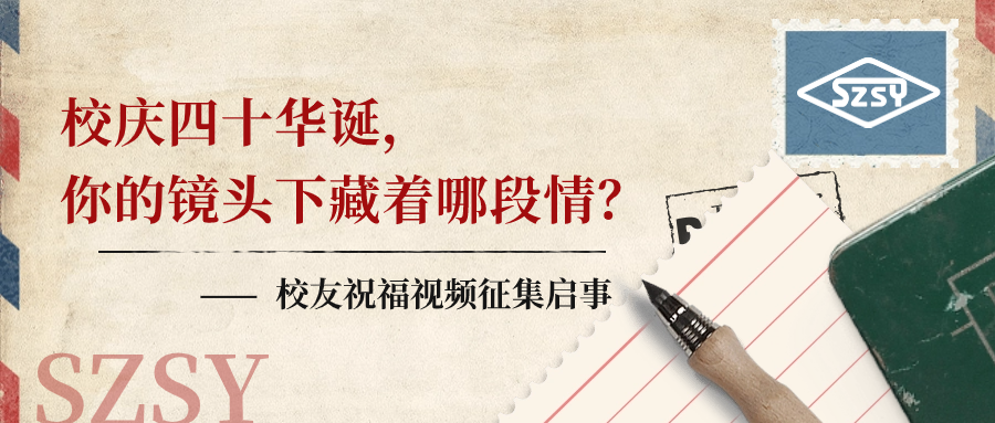 请将你的创意之作于2024年12月31日之前发送至邮箱:jjq@szsy.cn,邮件标题注明“40周年校庆视频投稿——学部/级(届)/班级/姓名”,可随件另附个人简介。