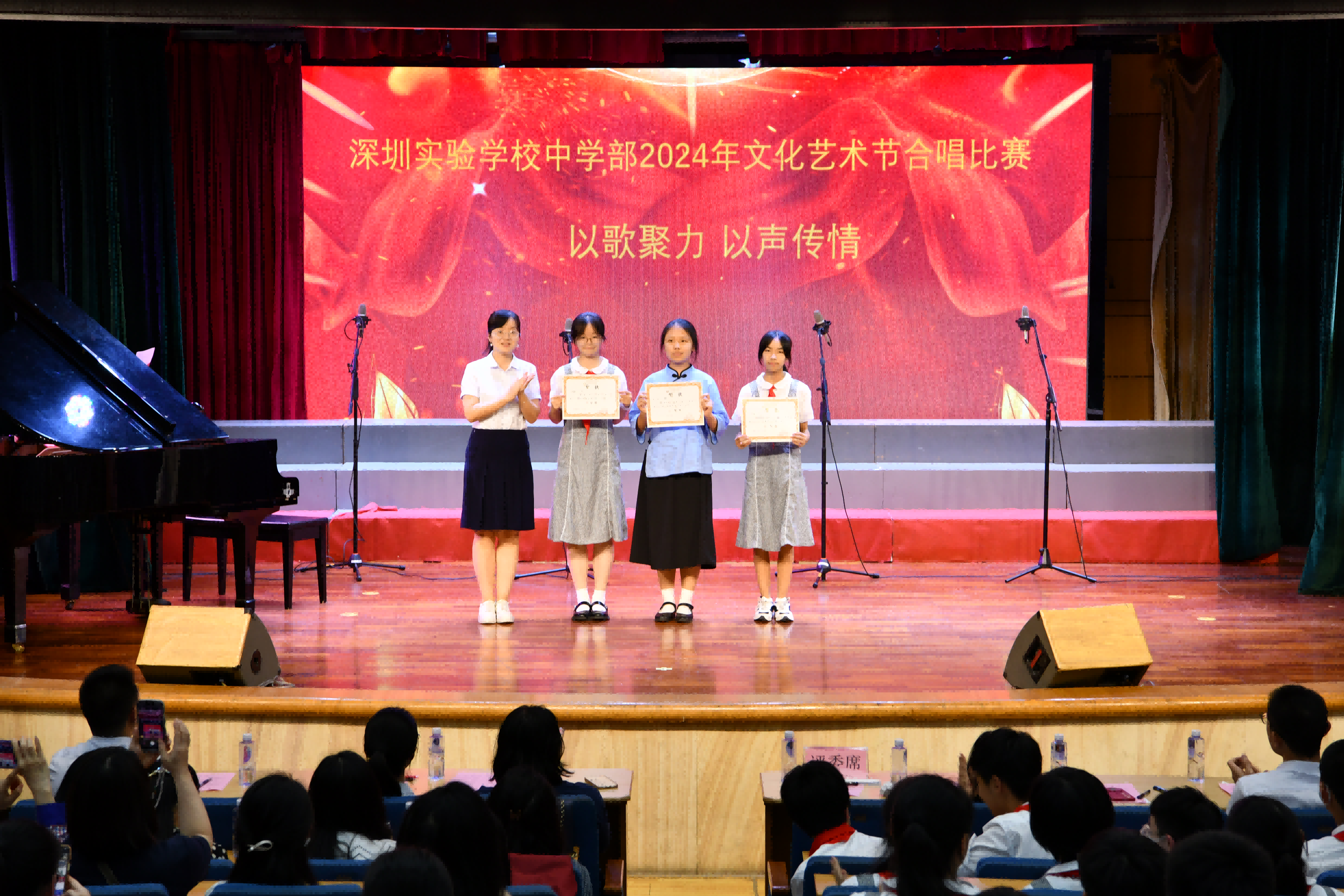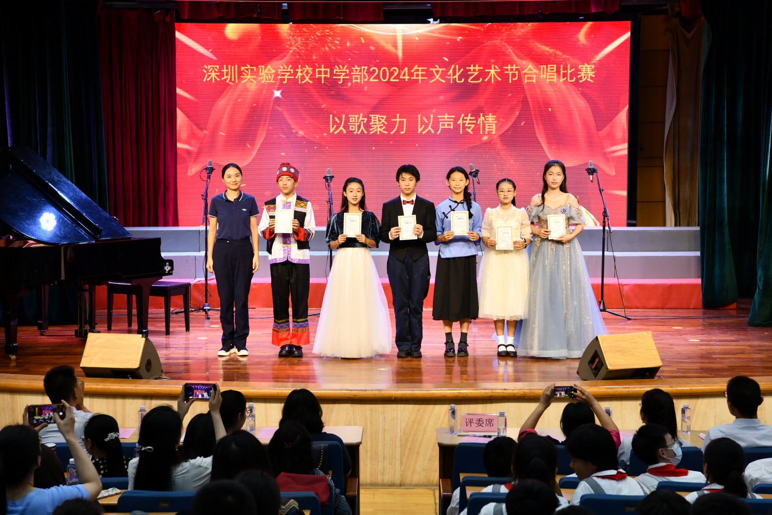 至此,本次班级合唱比赛也落下了帷幕,我们共同见证了一场精彩纷呈、充满活力的艺术盛宴。同学们以饱满的热情和卓越的才华,展现了实验学子的风采,诠释了“以歌聚力,声韵传情”的深刻内涵。(文/七年级(3)班谢沛颐 图片/罗宏才)