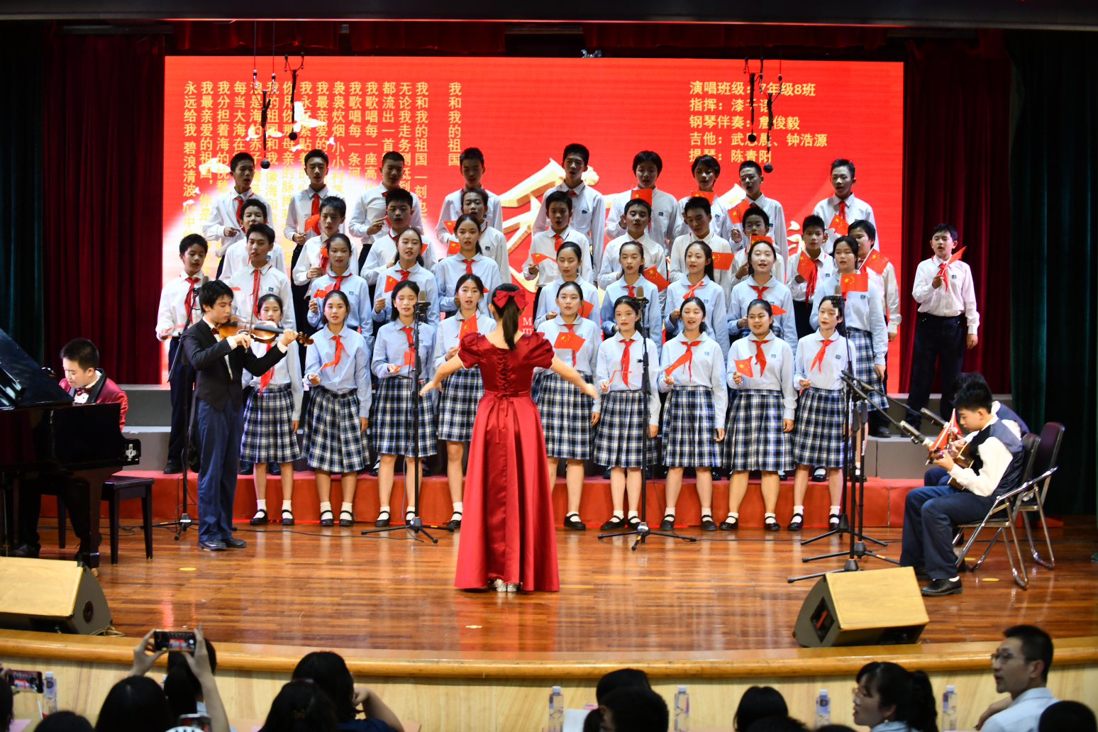 七(8)班的同学为我们带来了歌曲《我和我的祖国》,台上每一位同学都展现出自信的笑容。他们用歌声传递了希望,唱出了与祖国心心相印,一刻也不能分离的爱国之情。