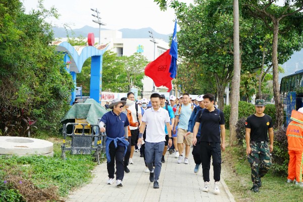 扛着大旗的同学大步走在队伍的前面、保持着高昂的士气;同学们互相谈笑着,给对方以鼓励;虽然疲惫,但随行老师们依然坚持陪我们向前走着,整个队伍没有停下的意思。在大家的感染下,我们逐渐步履轻盈。常常并不是因为看见希望才坚持,而是因为坚持才能看到希望。