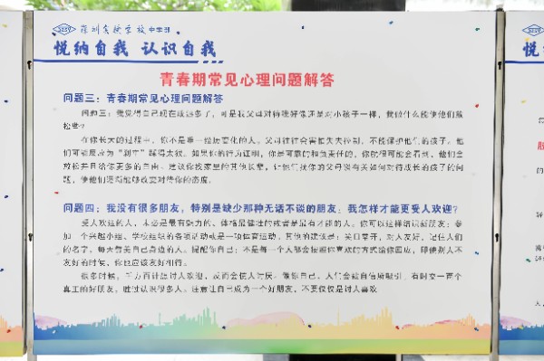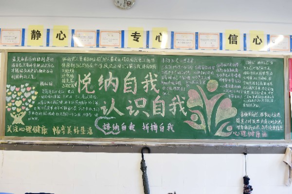 为了普及心理健康知识,主要开展了三个方面的内容。一是心理知识系列展板,在东楼一楼前厅,设置了心理知识系列展板。展板分为诗歌《当我真正开始爱自己》、心理漫画《让人成长的心理法则》、青春期常见心理问题解答、心理漫画《保持长期自律的方法》、《安慰人速成指南》、《心理书籍推荐》、《心理咨询热线》等七大内容。二是西楼电子屏,播放心理相关视频,以及2021年心理健康教育周的活动回顾,营造关注心理健康的校园氛围,让学生了解改善心理健康的方法。三是心理主题黑板报,以“悦纳自我,认识自我”为主题,各班设计并绘制了具有班级特色的心理健康主题黑板报,让学生有意识地关注自身,关爱自己。