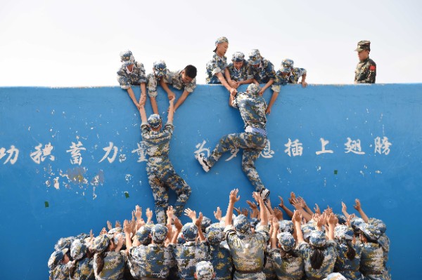 在团队浮桥活动中,同学们用双肩扛、用双手托起同学,将一位位队友渡过彼岸。在挑战三米高的“成功墙”时,经历五次“重新再来”,同学们不言放弃,齐心协力,用自己的全部力量将所有同学推举、拉上成功墙。特别是最下面的两位同学,他们跪坐着当人桩,咬紧牙关,承受重压和疼痛,不放弃任何一位同学。泪水和欢笑交织,温暖与友爱凝结。