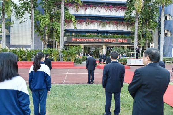 3月6日早7时50分,伴随着迎宾曲和掌声,获奖学生在家长的陪同下步入现场,中学部2023年“实验学校奖”颁奖仪式隆重开始,中学部副部主任、学生处主任杨宁主持。在激昂的旋律下,国旗护卫队护旗手护送国旗、校旗入场,国旗在嘹亮的国歌声中升起。仪式上,中学部副部主任王兵宣读了《深圳实验学校中学部2023年“实验学校奖”、“提名奖”的表彰决定》,本年度共有17名同学获得“实验学校奖",共有25名同学获得“实验学校奖提名奖”。他们是父母心中的好孩子,是老师和同学心中的好榜样,期待他们未来成为学校的骄傲。