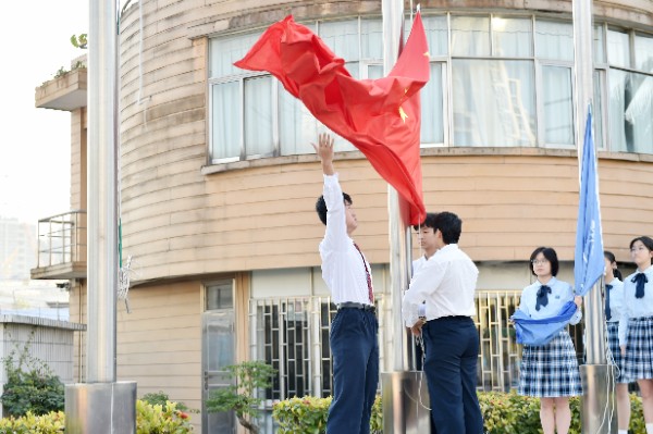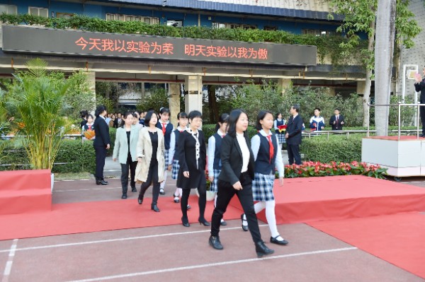 仪式最后,中学部为获奖学生和家长升起了光荣的实验校旗。实验校旗在空中迎风飘扬着,深蓝色的旗帜是实验的文化与精神。今天我以实验为荣,明天实验以我为傲!