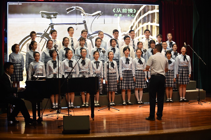 初一(8)班同学的《青花瓷》,合声优美,微笑陶醉,令我们沉浸在美好的歌声中;接下来是(5)班的《四季的问候》,歌词清新,旋律悠扬,表现了追梦少年们的执著;(6)班《在灿烂的阳光下》,吐词铿锵,精神饱满,动作整齐划一,使我们感受到了别样的爱国情怀;(1)班的《大鱼》蕴藏的深情使我们久久回味;(3)班的《当你老了》则带给我们对父母深深的感恩;(2)班的《芦花》和四班的《乌苏里船歌》又把我们带回了烽火硝烟的时代;(7)班同学演唱的是《自由飞翔》,优美的旋律,投入的情感,让我们察觉了歌声中美好的意境;校合唱团的两首歌《从前慢》及《雪花的快乐》更让我们明白了音乐的美,艺术的美。