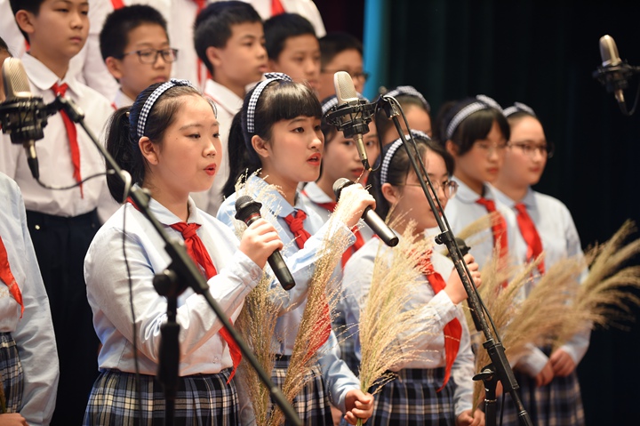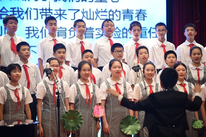 五月五日下午,五楼小礼堂洋溢着节日的气氛。初一的男同学穿着整齐的服装,女同学化着淡淡的妆,青春的脸上洋溢着期待和喜悦,放歌高唱,祝福实验,祝福祖国。