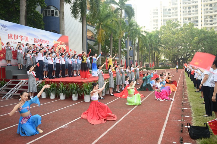 大会最后,全体师生和家长代表振臂高呼“祝福祖国:生日快乐!再铸辉煌!”余音绕梁,久久不绝,学子似乎意犹未尽,久久不愿离去。