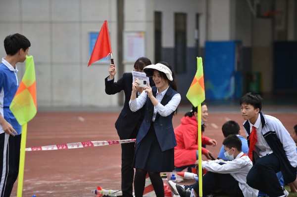 比赛开始后,同学们开始忙碌地组装水火箭。随后只见眼前红旗高高举起,又与哨声一同落下。火箭被同学们发射了出去,跃上了草坪,甚有几组飞出了场地。有的小组发挥较好,收获结果后激动雀跃;有的小组虽略有失误,但很快调整了过来,重新进入状态。有些不同组的同学还互相帮助,甚至把他们的“幸运发射器”借给了需要帮助的同学。还有许多观战的同学从场外过来,去帮助自己班的选手,与他们一同努力,随机应变地切换战术。