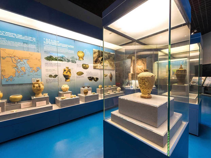 一件文物折射一段历史,一段历史积淀一份文化。我们首先参观的是“古代深圳展厅”。走进展厅,映入眼帘的是一片蓝色,地面是蓝色的,墙上也是蓝色的,海洋文化背景衬托着巨幅铜雕。展览通过数百件深圳地区出土的文物、历史文献以及栩栩如生的模拟场景,展示了有着6000多年人类开发史和海洋经济发展史、1700多年的城市史、600多年的海防史、悠久的广府名系和客家移民史的“前世深圳”。这里浓缩了“深圳”7000年的历史事件和文化元素---新石器时代的猎人,东晋南头古城、客家围屋,大鹏所城抗英的殊死对决,也成了老师们竞相拍照留影、学习研究的“打卡之地”。