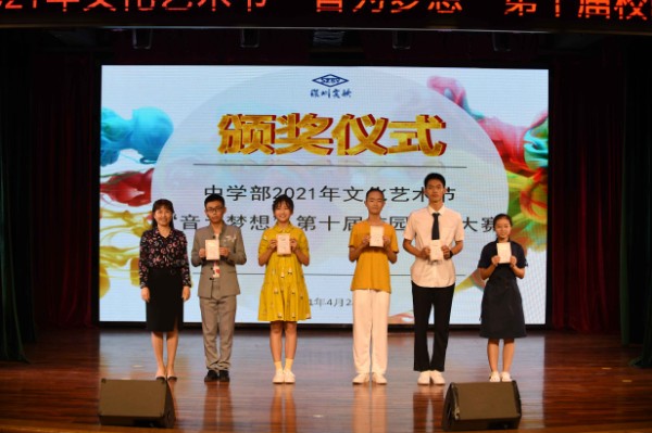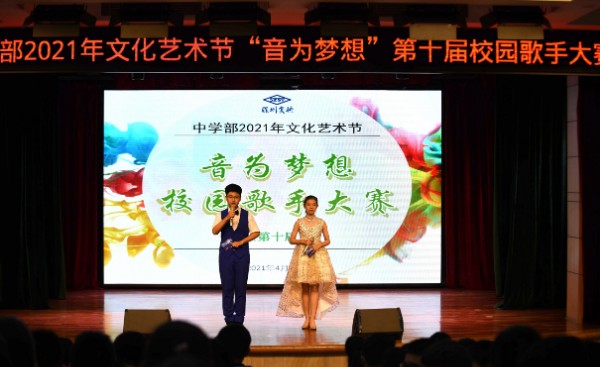 2021年4月28日下午,中学部“音为梦想”第十届校园歌手大赛在小礼堂激情开唱。经过班级初赛、年级复赛的层层选拔,11组选手成功晋级,站上了全校总决赛的舞台,同台献艺,带来一场视听盛宴。在灯光与微笑构成的舞台,歌手们舞动青春,用美妙的歌声感染着现场观众与听众。温婉抒情的《梦里花》、轻松欢快的《New soul》、气势磅礴的《踏山河》、情怀满满的《我的中国心》以及展示青春、友谊、奋进的小组唱《我们一起闯》等,一首首悦耳动人的歌曲让观众身临其境般步入唯美的场景。歌手赛尾声,来自表演嘉宾初三4班的杨佳颖同学带来的一首《明天会更好》,唱响了新时代青年对未来的美好期待,在建党100周年之际,祝愿我们的祖国明天更美好。