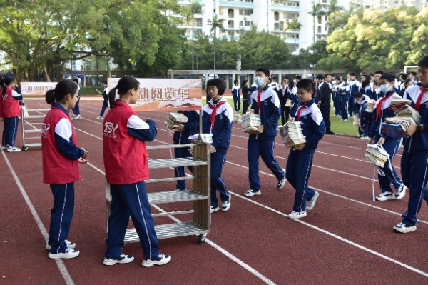 11月20日晨会,在运动场举行了经典书籍我捐赠——“捐出一本好书 点亮一盏心灯”捐书仪式。