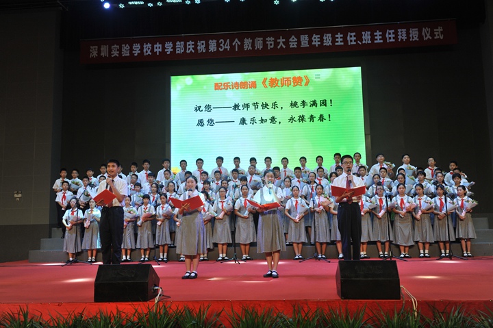 九月,一个收获的季节,一个感恩的季节,一个属于教师的季节。深圳实验学校中学部每年通过教师节庆祝大会暨年级主任、班主任拜授仪式,向我们无私奉献的老师献上我们最真挚的敬意,感谢老师的无私奉献,同时希望同学们能够把对老师的这份感激之情转化为今后学习的动力,学业有成,回报社会。