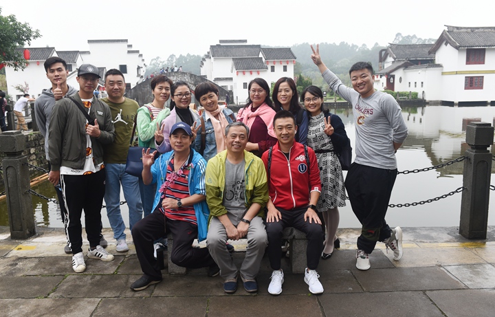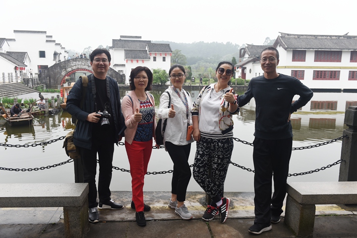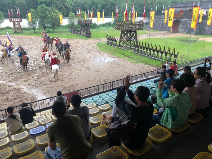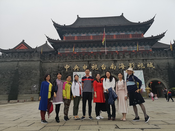 早晨8点从中学部准时出发,途经南沙大桥,领略其1688米的雄伟壮丽。上午11点到达有“中国好莱坞”美誉的南海影视城。城内所见,有真神圣天门的壮观,有小桥流水人家的静谧,还有“三英战吕布”的马战表演。牵绊住老师们前行脚步的,是其中古朴典雅的江南水乡:佳人驻足凝望,错落有致的青砖瓦房,古意古韵的小桥,多彩的油纸伞,瓦屋倒影。可能只有“水秀山清眉远长,归来闲倚小阁窗。春风不解江南雨,笑看雨巷寻客尝”来描述此刻的美景。