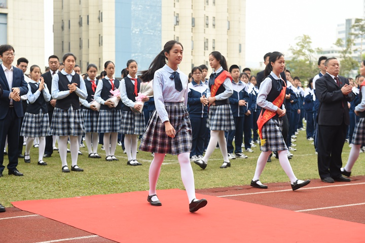 伴随热烈的掌声和欢快的乐曲,荣获“实验学校奖”的同学和家长并肩入场,接受大家的祝贺。庄重的升旗仪式后,龙校长代表学校宣读表彰决定,学决定对侯霁纭等20位同学颁发2019年“实验学校奖”,对陆松倩等32位同学颁发2019年“实验学校奖”提名奖,希望获奖同学继续努力,不断进取,永不满足,以更加优异的表现成为同学们身边学习的榜样,为校争光!