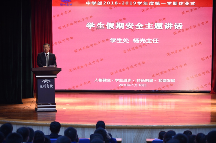 最后,学生处杨光主任作“假期安全”专题讲话。他希望同学们在假期里好好休息,好好学习,加强锻炼,既长身体又长知识,培养自己独立的生活能力,养成文明的行为习惯,能够科学安排自己的作息时间,做更多有意义的事情,度过一个平安、快乐、充实的寒假。同时,也叮嘱同学们假期一定要注意安全,提高安全意识,学会自我防范和自我保护。