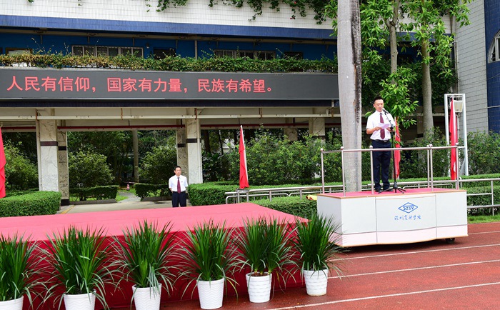 伴随着铿锵有力、整齐划一的脚步声,中学部国旗仪仗队擎起鲜艳的五星红旗护送到升旗台前。“升国旗,高唱国歌!” 五星红旗在全体师生的注目下缓缓升起,飘扬在实验蔚蓝的上空。