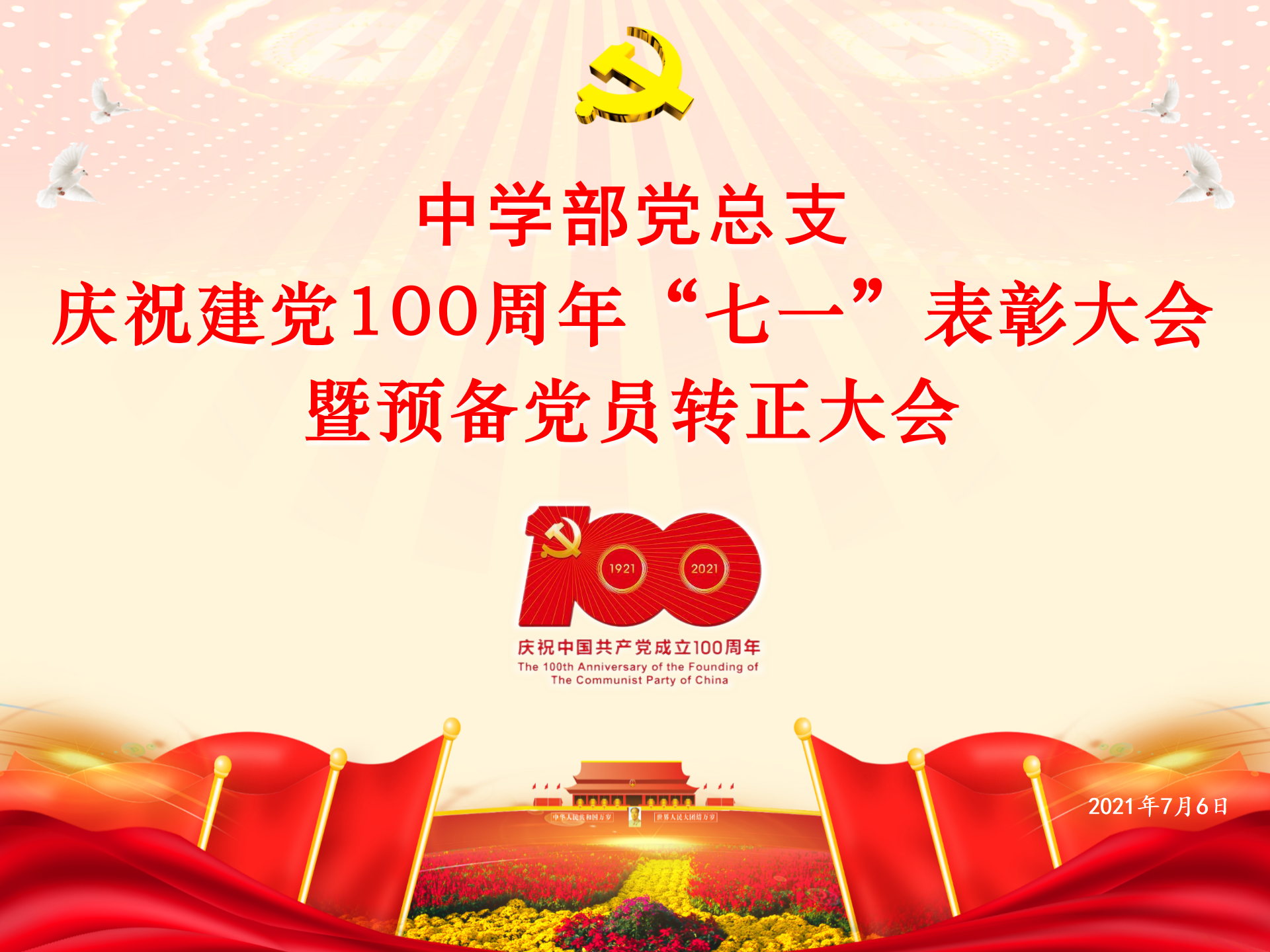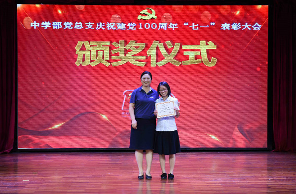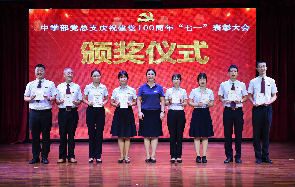 百年征程波澜壮阔,百年初心历久弥坚。建党百年,砥砺奋进,忆往昔,峥嵘岁月;看今朝,心潮澎湃。为庆祝建党100周年,不忘初心,牢记使命,中学部党总支于2021年7月6日16:00召开“七一”表彰大会暨预备党员转正大会。会议由靳军强委员主持,深圳实验学校党委副书记、纪委书记,中学部党总支龙萍书记及中学部全体党员出席大会。
