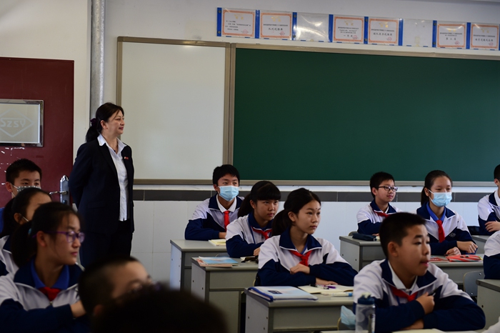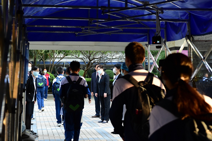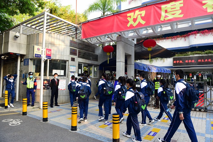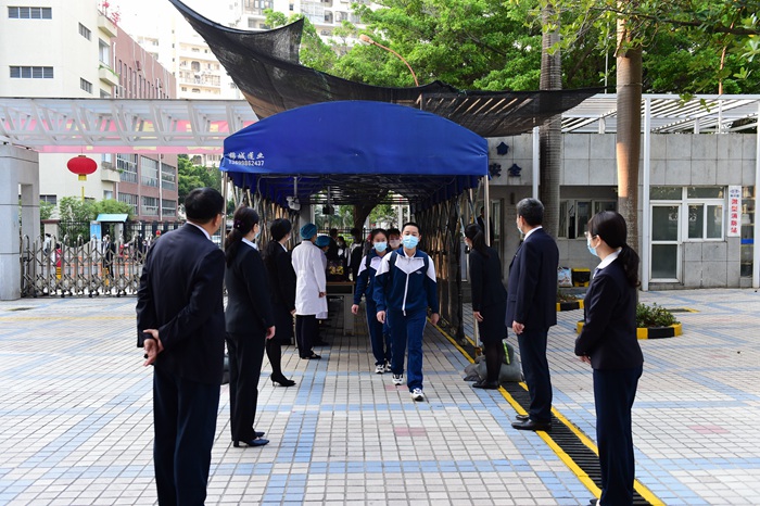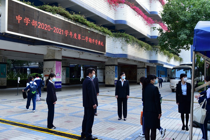 新学期第一天,深圳实验学校衷敬高校长、冯维丹副校长与部分集团领导前来巡视开学工作,对校园安全、疫情防控、教育教学常规、师生心理健康等情况进行了解,对中学部校园环境、教学秩序,师生精神面貌和工作学习状态表示满意。