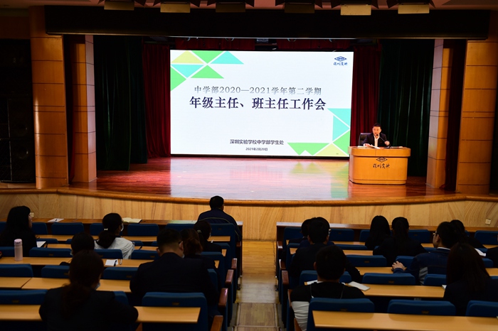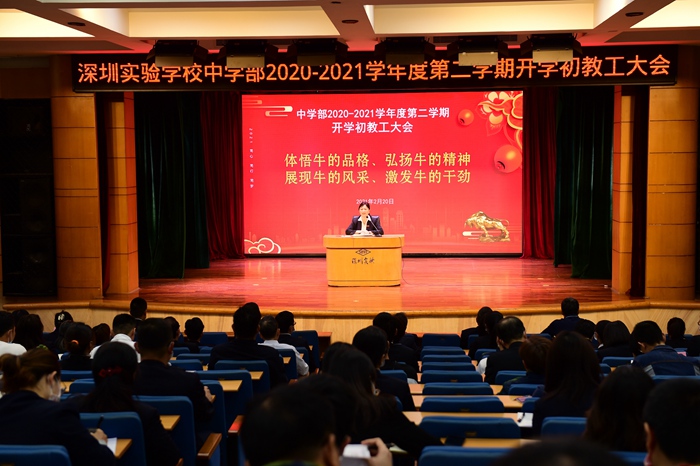 2月20日上午10:00,在中学部党总支书记龙校长的带领下,中学部全体教职工在五楼小礼堂召开了新学期第一次教工大会。她以“体悟牛的品格、弘扬牛的精神、展现牛的风采、激发牛的干劲 ”引入,发表了热情洋溢的讲话。首先,她对假期坚守在疫情防控工作岗位上的教工表示感谢,尤其指出开学前一周班主任对所有学生家长的电话访问,工作扎实有效;接着,龙校长对本学期主要工作进行了布置,希望全体教职工按照本学年度 “携手同行、共克时艰、提升自我、追求卓越” 的工作思路,开心努力地完成本职工作。