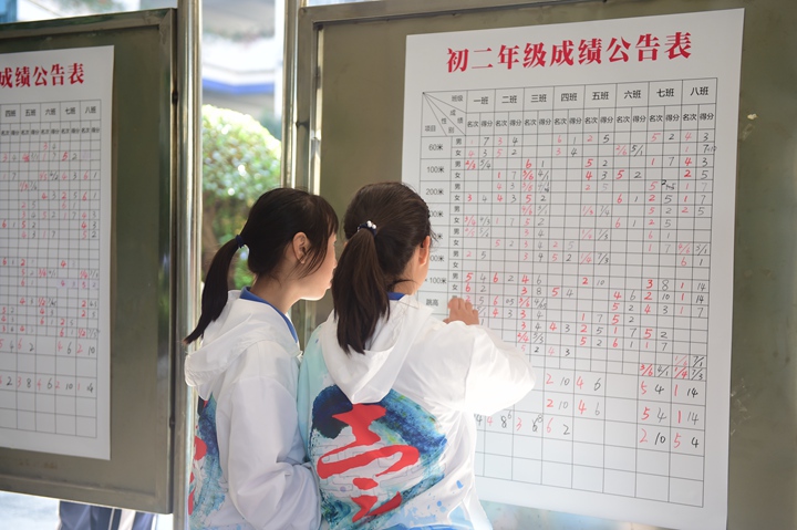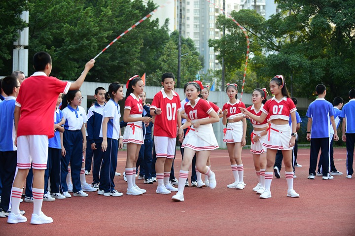 一个个轻盈的身影开始在长绳中来回闪烁。比赛有条不紊地进行,所有人沉住了气,专注于绳上的节奏,丝毫不被外界打扰。裁判员老师也因那飞快的人影被绕得眼花缭乱,只好数打头的同学的进绳次数,在倒数计数时逐个数跳过的人数。随着主裁判的一声哨响,比赛结束了,一天的竞技也告一段落了。在第二天阳光重回舞台之时,迎接校园的便是由全校师生共同参加的朝气蓬勃的开幕式了。 (文/初三(2)班 赵婉茹)