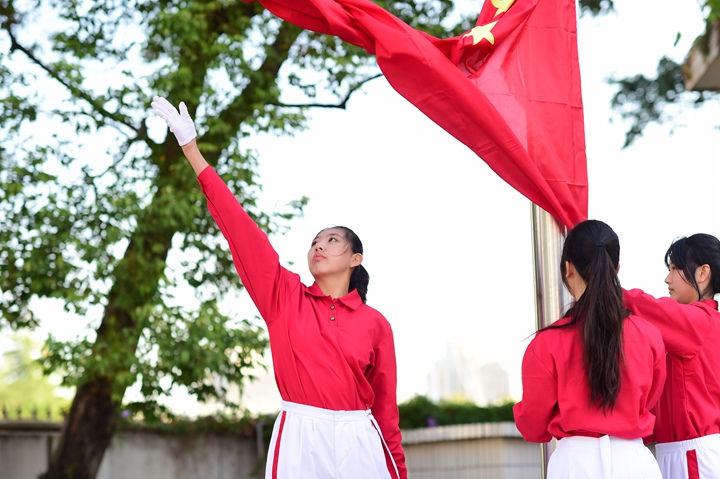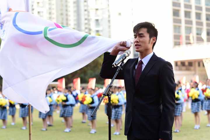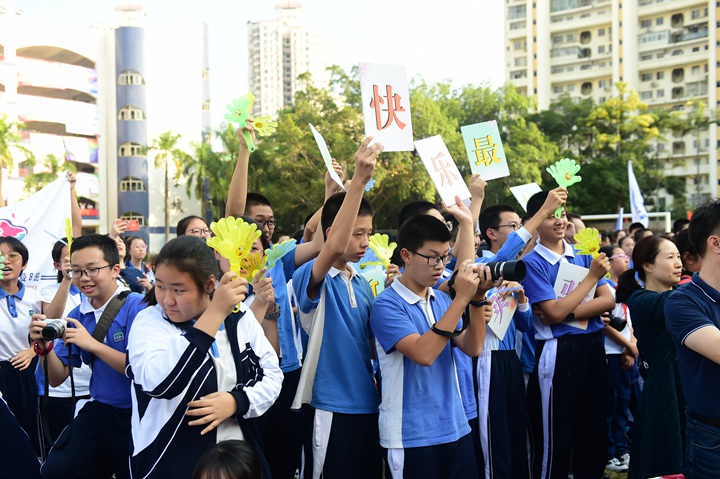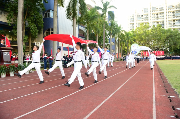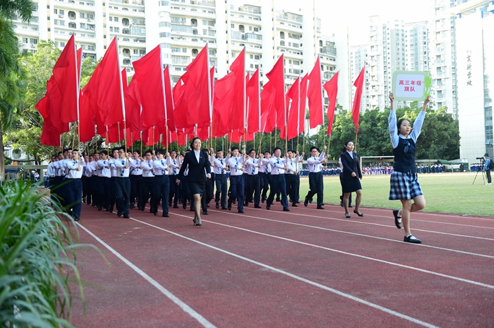一声“送旗”,全体肃立。中学部旗队高举国旗、校旗、运动会会旗,踏着矫健的步伐,整齐划一地走向升旗台。五星红旗冉冉升起,会场国歌声嘹亮。随着实验校歌响起,三面旗帜在风中飘扬,“不断进取,永不满足”已深入实验人内心!深圳实验学校副校长、中学部部主任龙萍在开幕式上致辞。龙校长提到,70年来,中国体育事业蓬勃发展,涌现出许多体育健将为祖国争光。一年一度的体育节,是实验学校大力实施健全人格教育、有效教学和学校“四个高地建设”的有效途径。她号召运动员们在赛场上不畏困难,勇攀高峰,赛出风格,赛出自信,赛出友谊,体现出“更高、更快、更强”的奥林匹克精神!