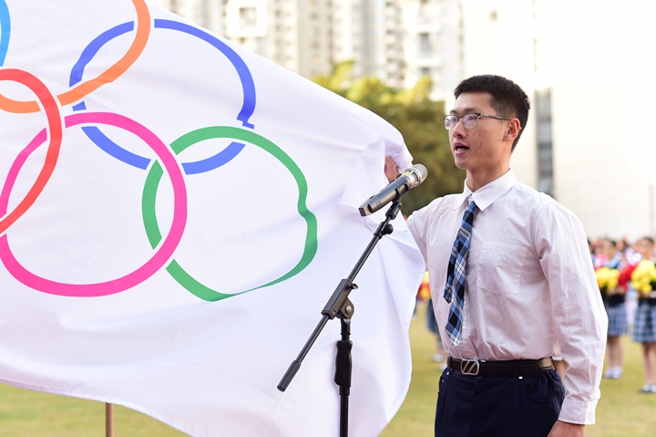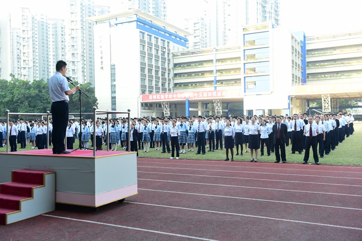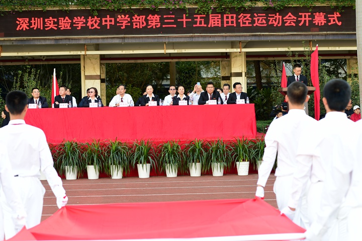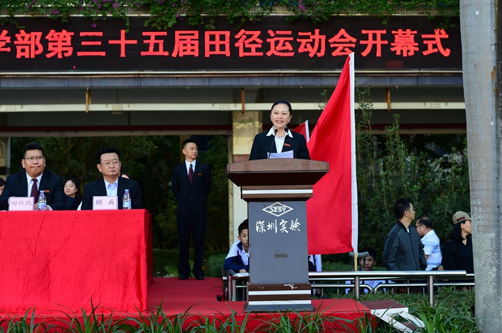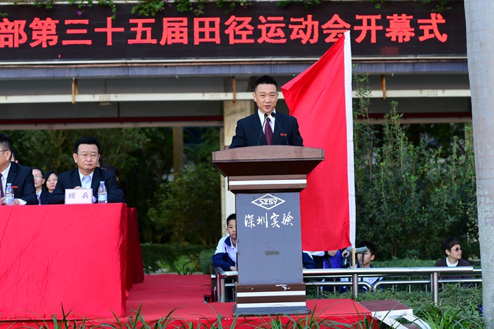在全体师生的注目下,衷敬高校长郑重宣布:深圳实验学校中学部第三十五届田径运动会开幕!随后,运动员及裁判员代表分别庄严宣誓,为比赛顺利进行郑重承诺。