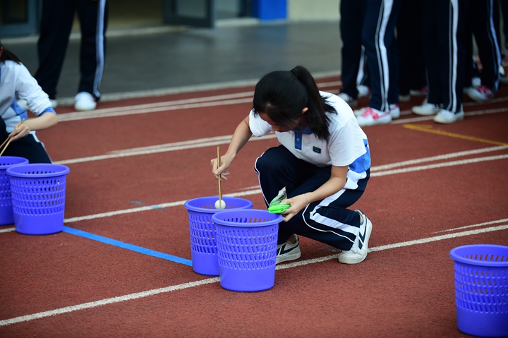 第二项比赛是抛接小布球迎面接力赛。同学们以灵巧的身姿绕过障碍物,刹住脚,拾起自己筐中的沙包向对面的筐里扔。尽管这是新的项目,同学们还是以彼此的默契共同完成了比赛。此时,头顶的骄阳渐渐失去了热气,一点点过渡成了温柔的昏黄,在天际线开始谢幕。但它却带不走操场上的如火热情,最后一个项目做好了准备,学生们一个个在长绳面前屏息凝神,心中默默倒数着……