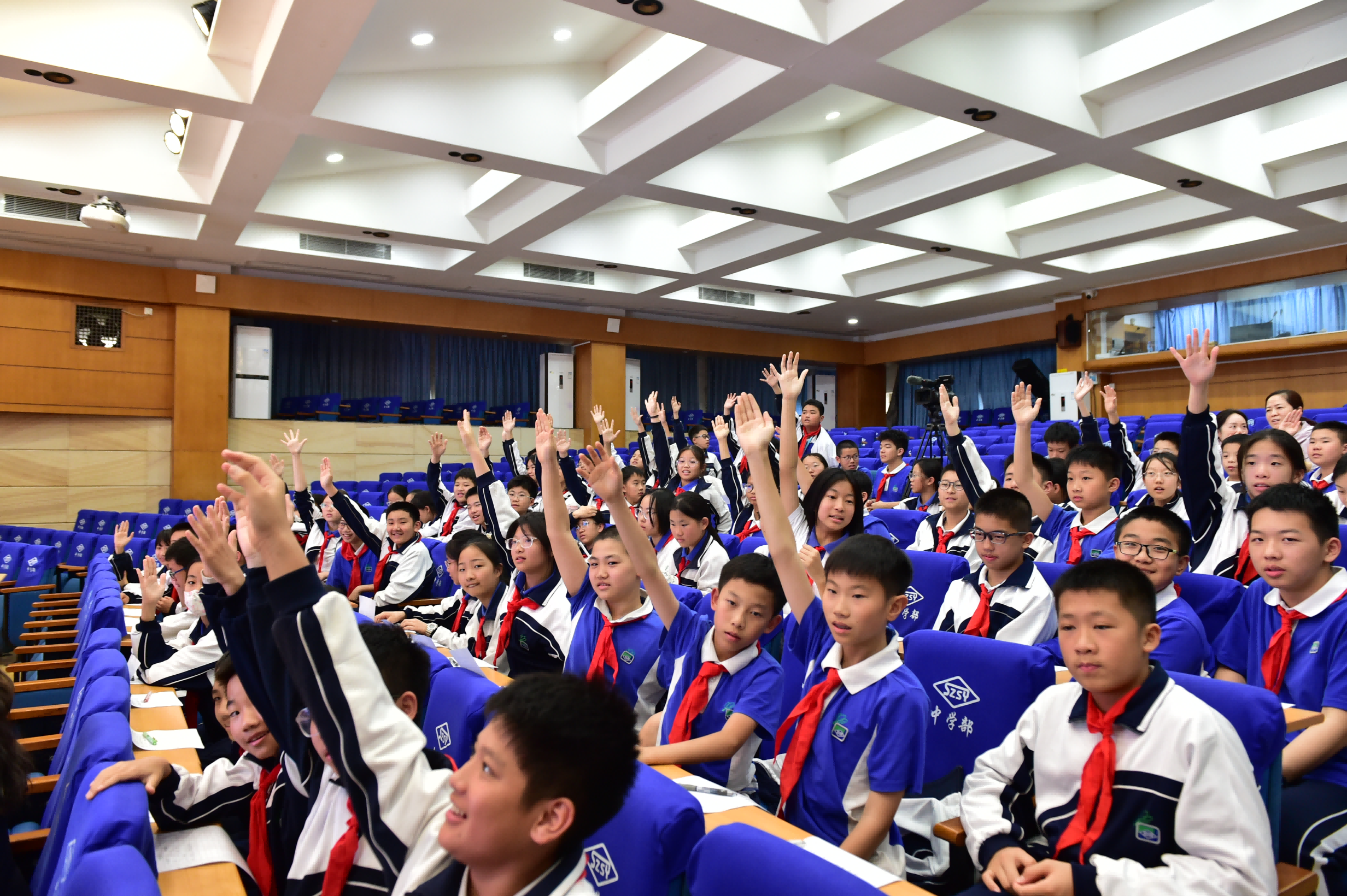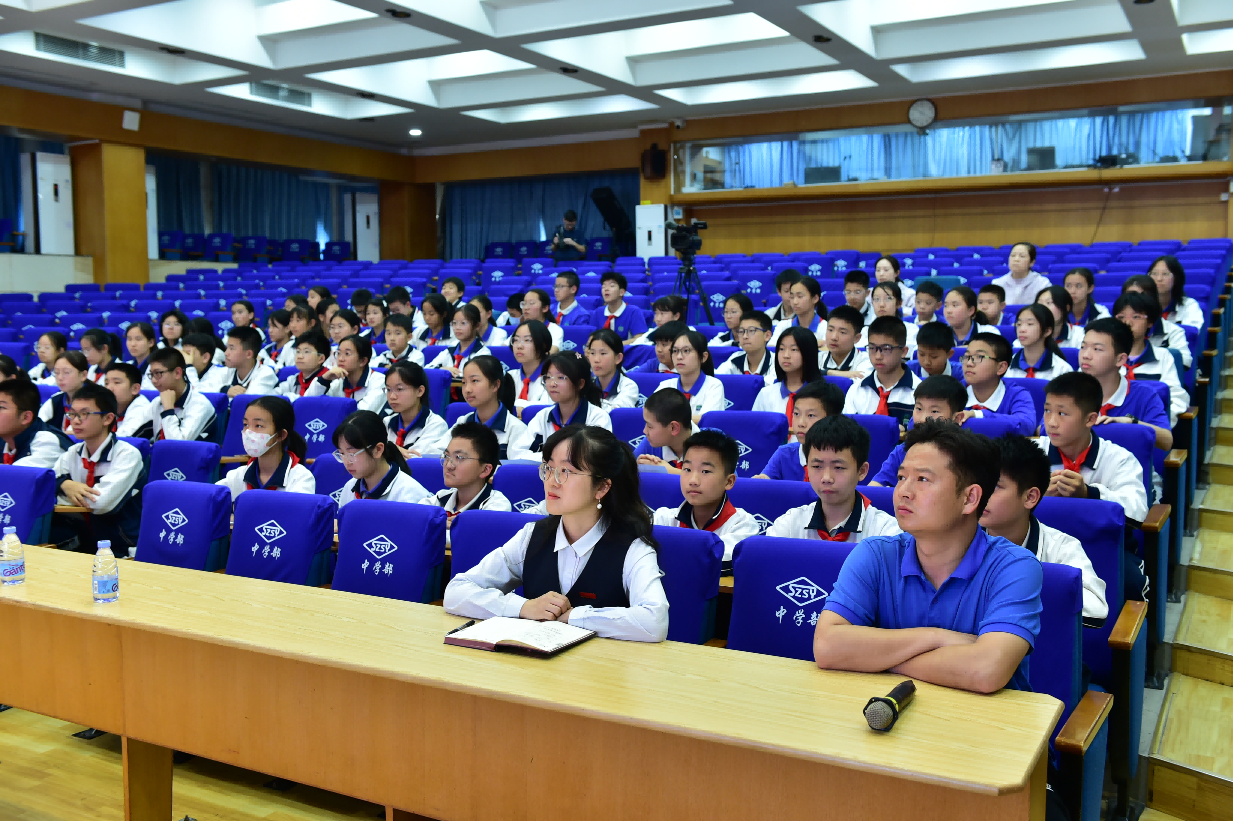 讲座在五楼小礼堂进行,七年级学生代表现场就座,各班级在教室收看转播。